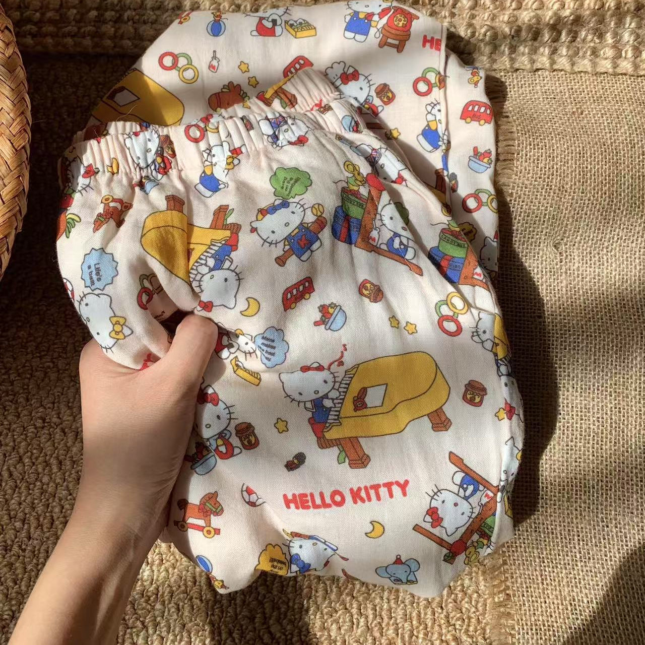 家居睡裤 A类纯棉双层纱布可爱卡通睡裤 可外穿 长裤 米黄kitty短袖