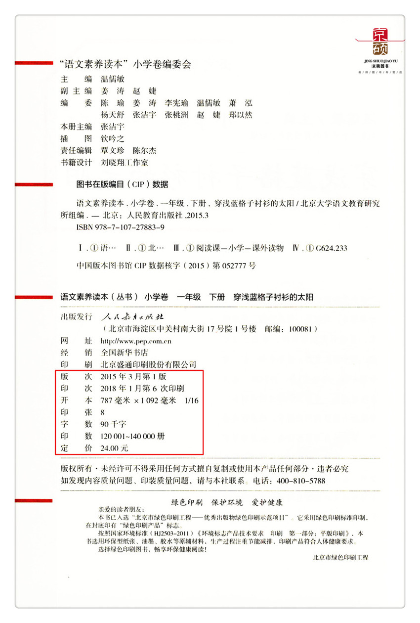 太阳 小学卷 一年级下册 语文素养读本丛书人民教育出版 语文素养读本丛书小学卷穿浅蓝格子衬衫 温儒敏主编 社 配新教材