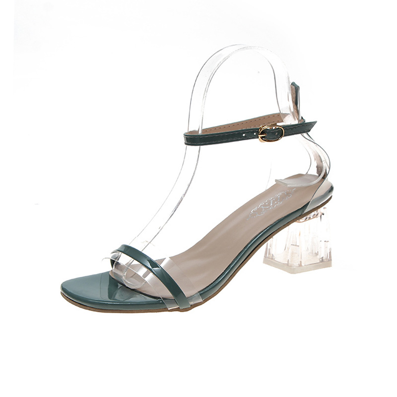 女粗跟漏趾罗马 百搭仙女风一字带水晶高跟鞋 透明凉鞋 女夏2025新款