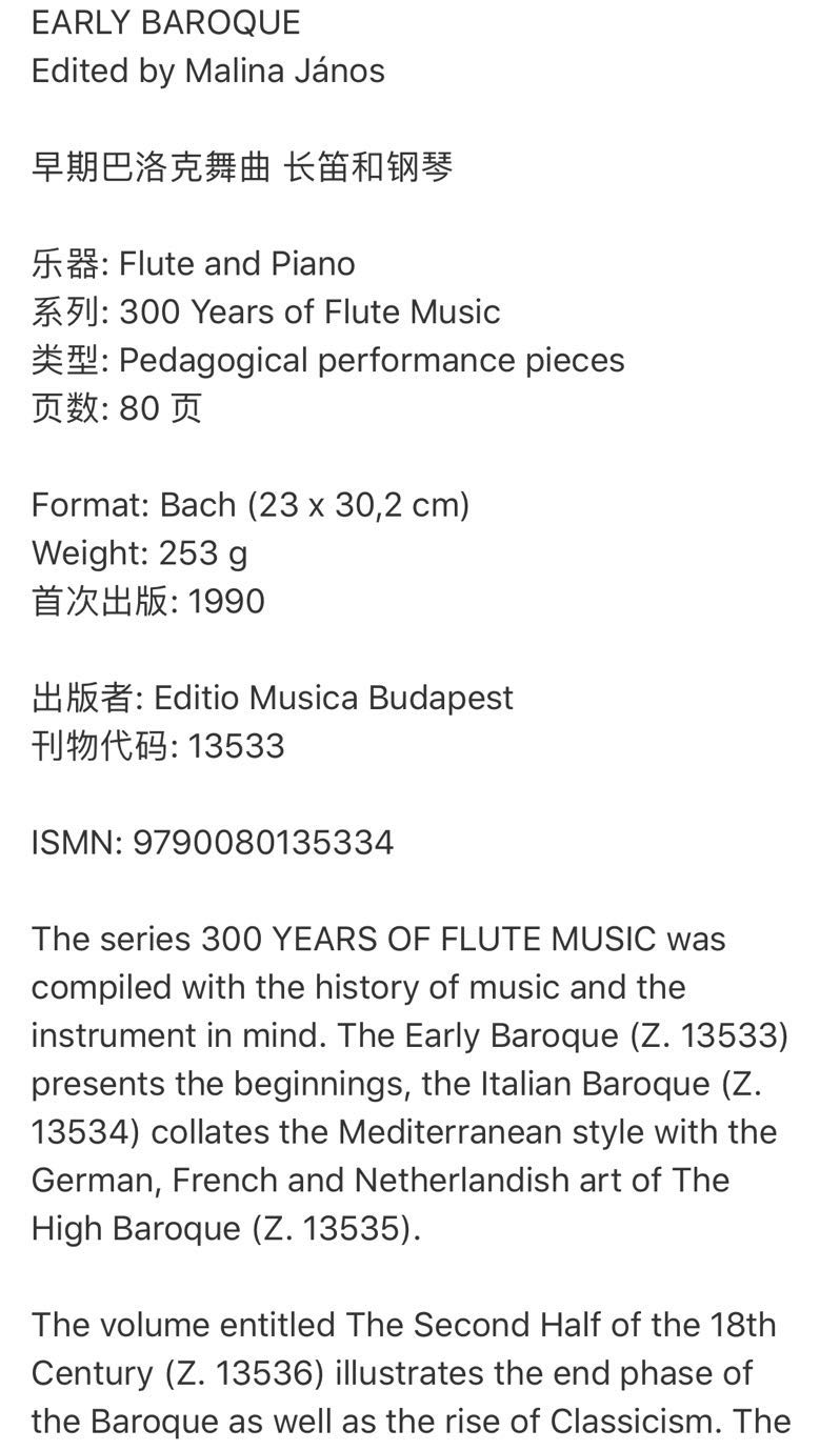 EARLY 长笛和钢琴 Malina 早期巴洛克舞曲 BAROQUE Piano 原版 and 布达佩斯 Z13533 进口乐谱书 Flute Janos