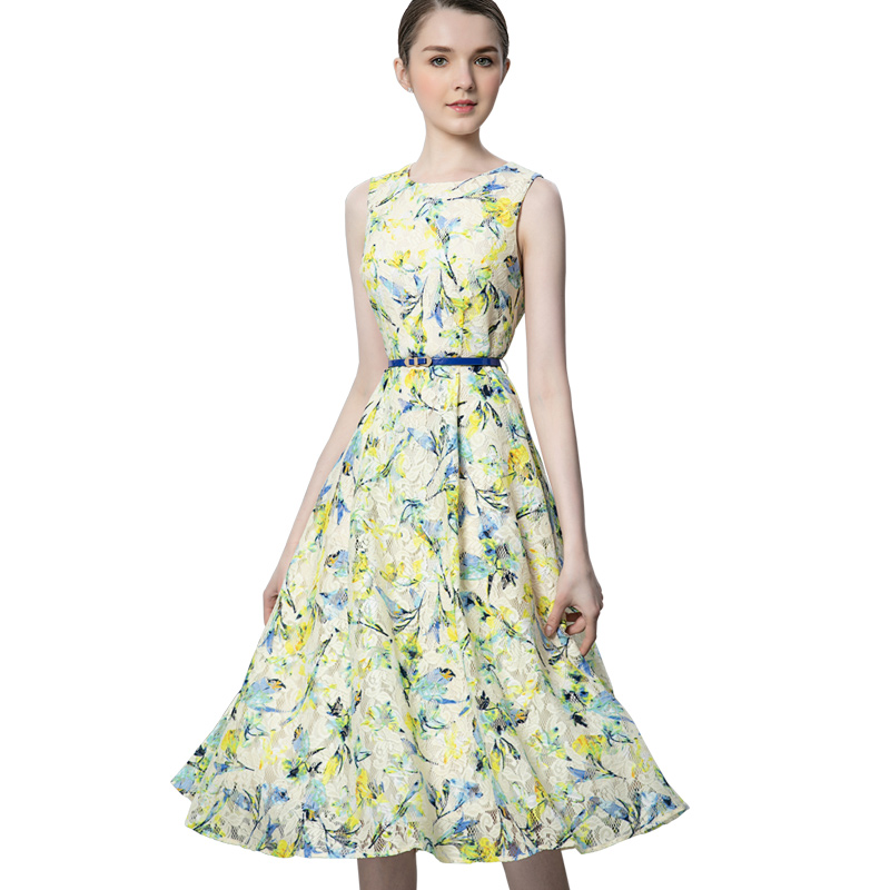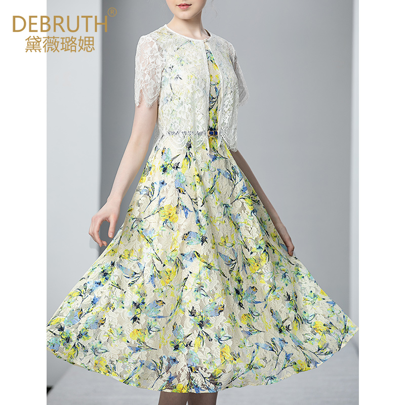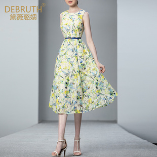 法式 新款 气质收腰A裙黄 夏季 黛薇璐媤碎花蕾丝背心连衣裙女中长款