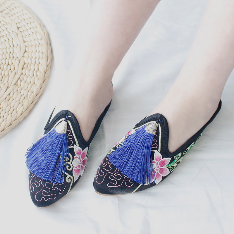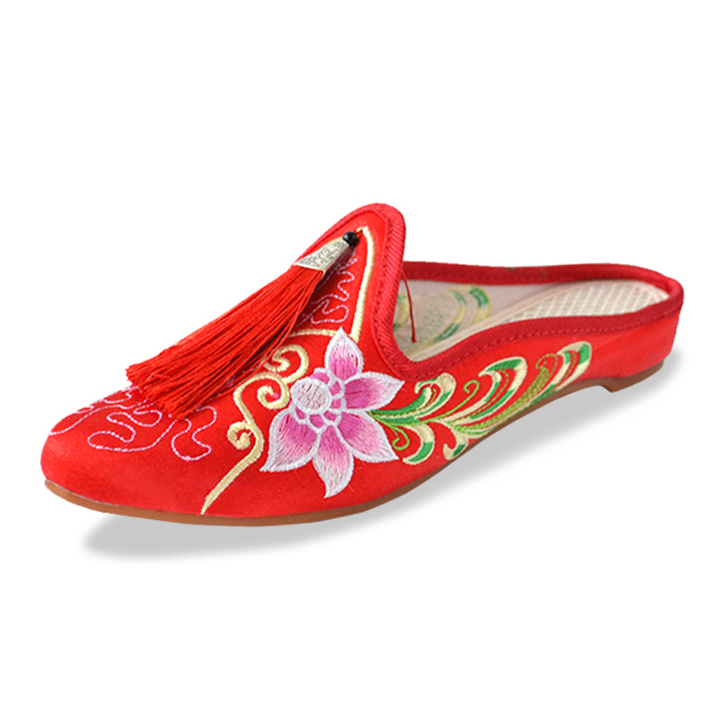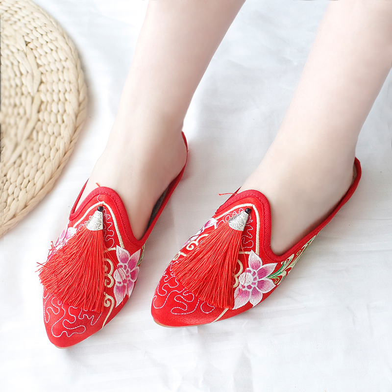 女包头半拖凉鞋 民族复古风真丝绸缎绣花鞋 夏 尖头时尚 老北京布拖鞋