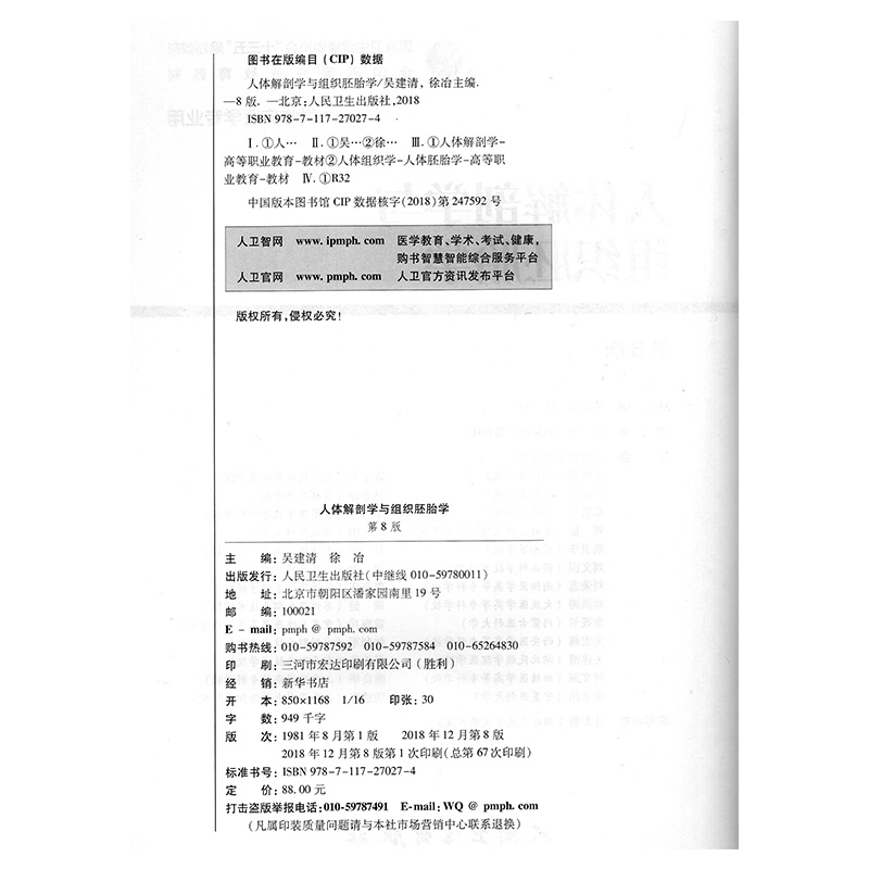 高等职业教育 国家卫生健康委员会 人民卫生出版 人体解剖学与组织胚胎学 社 徐冶 第8版 供临床医学专业用 正版 十三五规划教材