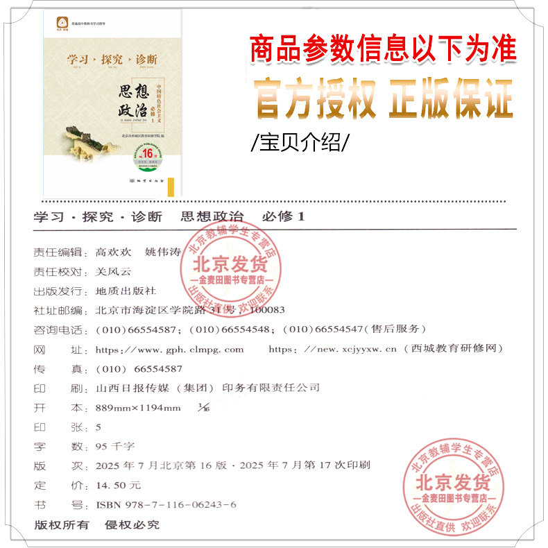 学探诊高中政治必修一2025新 第15版 北京市西城区教育研修学院编 学习探究诊断思想政治必修1中国特色社会主义 2025秋北京西城16版