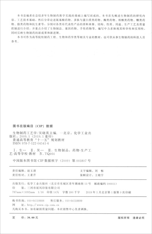普通高等教育十一五规划教材 化学工业出版 生物工程生物技术系列 编 社9787122045416 吴晓英 生物制药工艺学