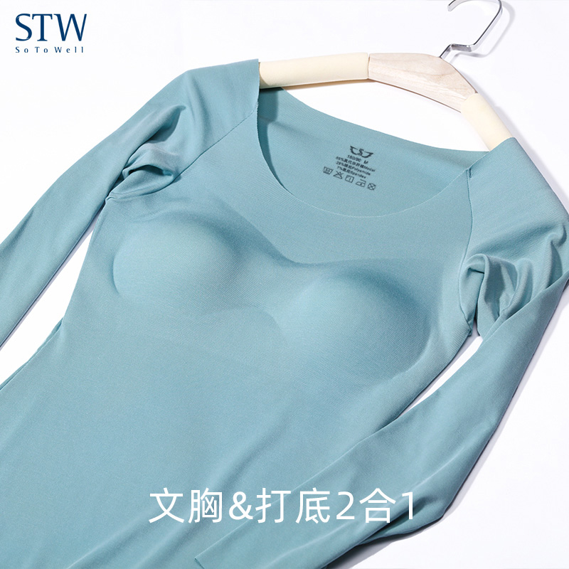 STW女士带胸垫保暖内衣无痕莫代尔长袖 低领打底秋衣 保暖上衣冬季