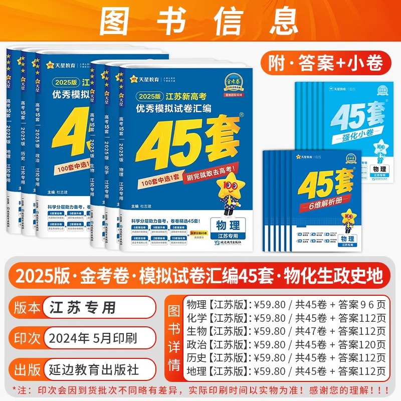 备考2025江苏版 天星45套金考卷新高考优秀模拟试卷汇编四十五套二轮复习高三总复习卷子数学物理试卷真题卷语文英语化学政治历史