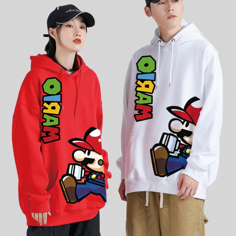 学生青少年连帽加绒新 长袖 卡通马里奥卫衣男宽松休闲大码 潮流新款