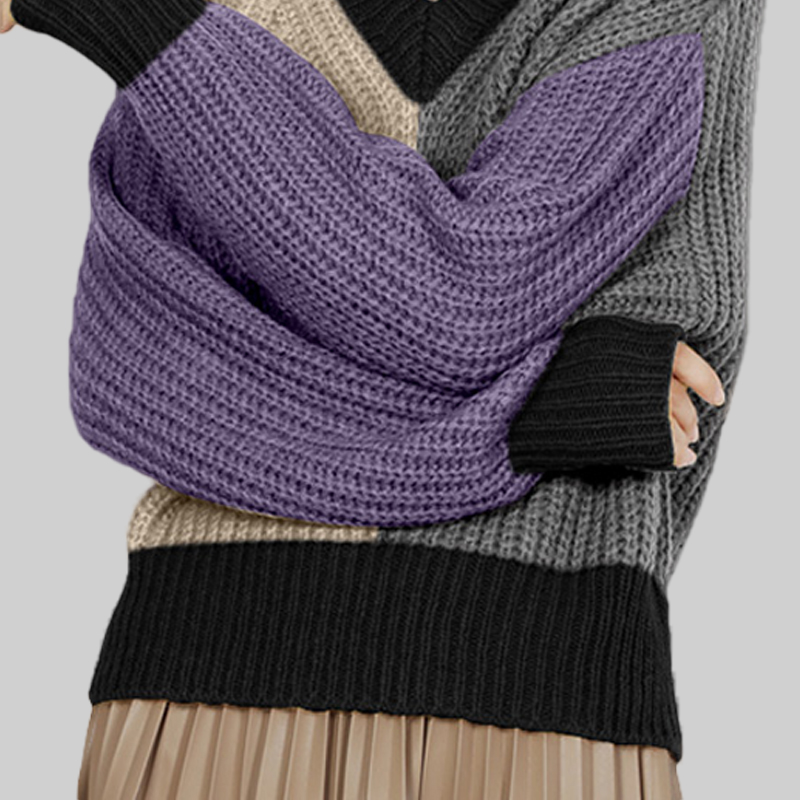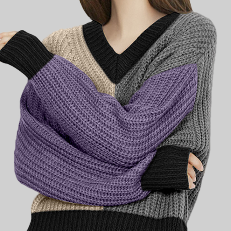 慵懒高级感V领毛衣女2025年冬新款 上衣 名媛拼色宽松显瘦套头长袖
