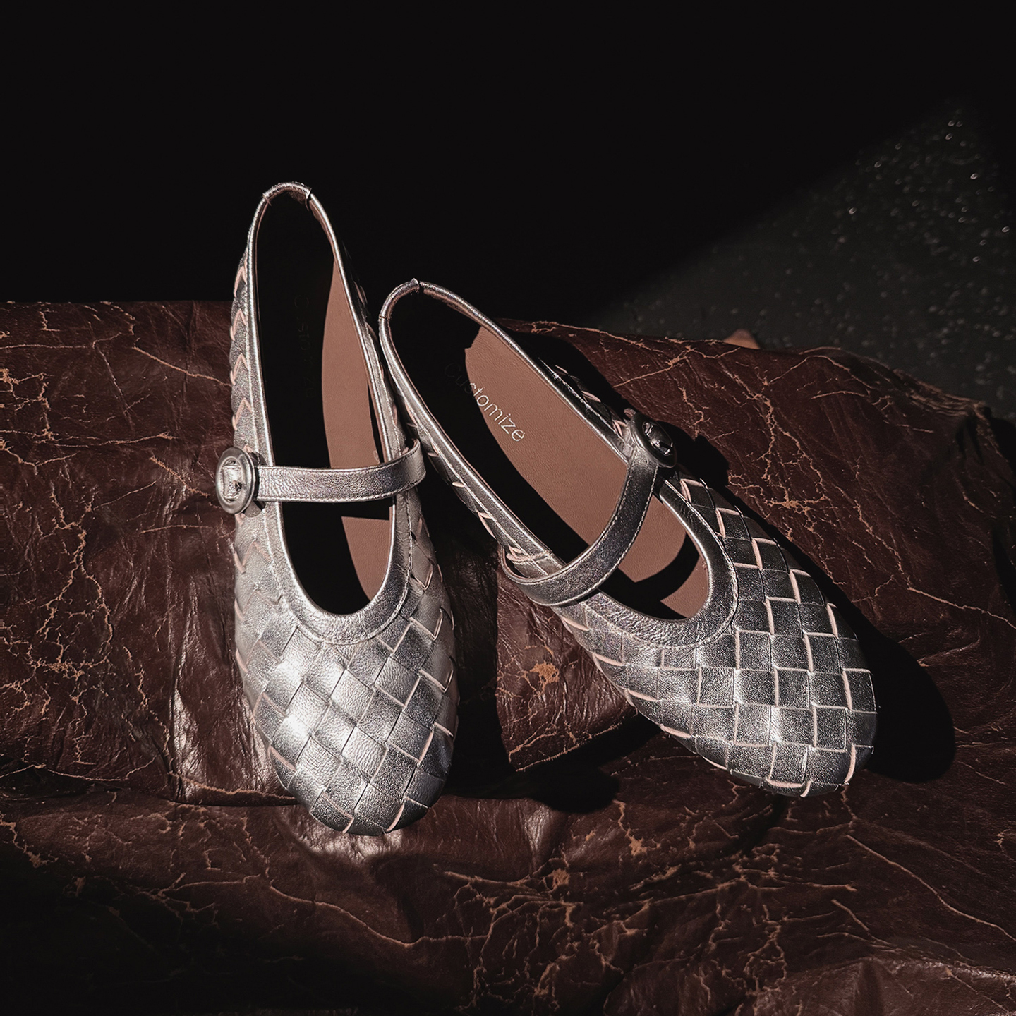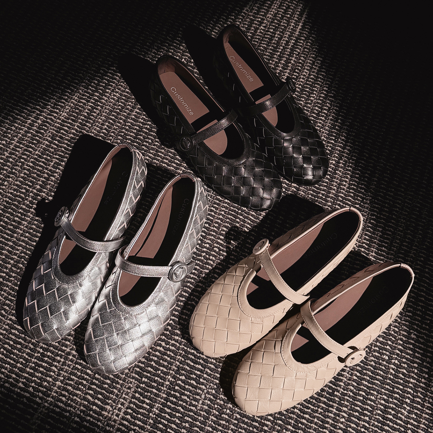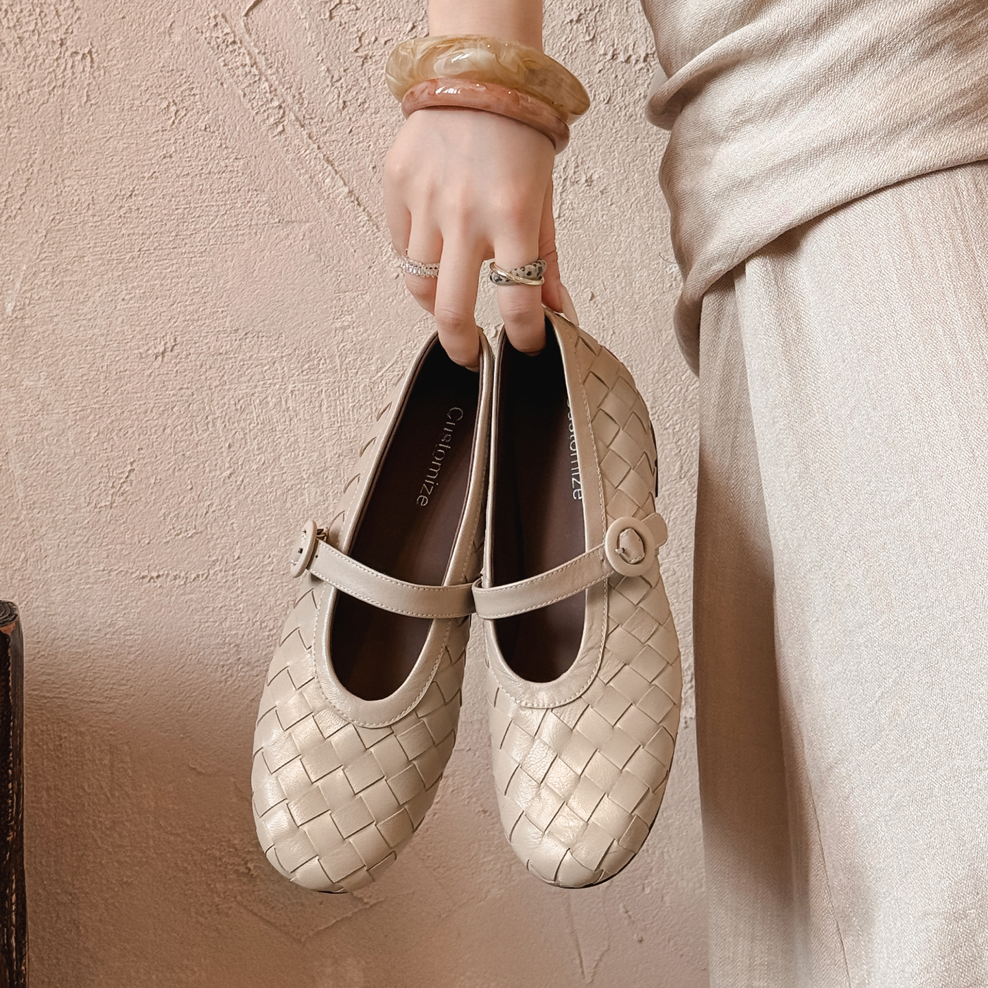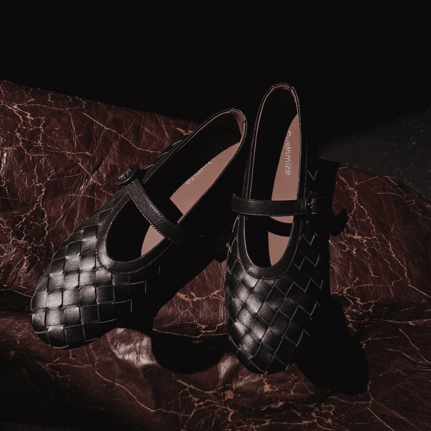 女 一字扣浅口羊皮编织单鞋 开怀依足玛丽珍鞋 松弛罗马舒适平底鞋
