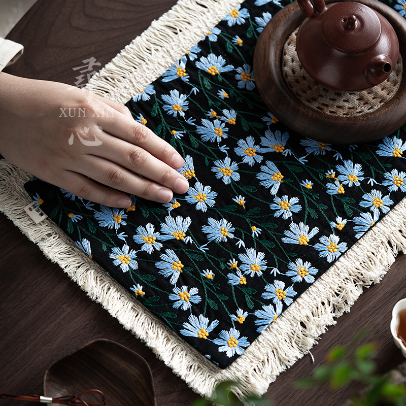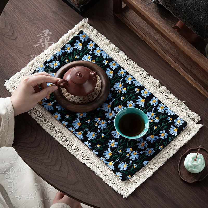 寻心国风棉布繁花刺绣干泡席茶道配件茶室茶台桌布中式 禅意茶垫子