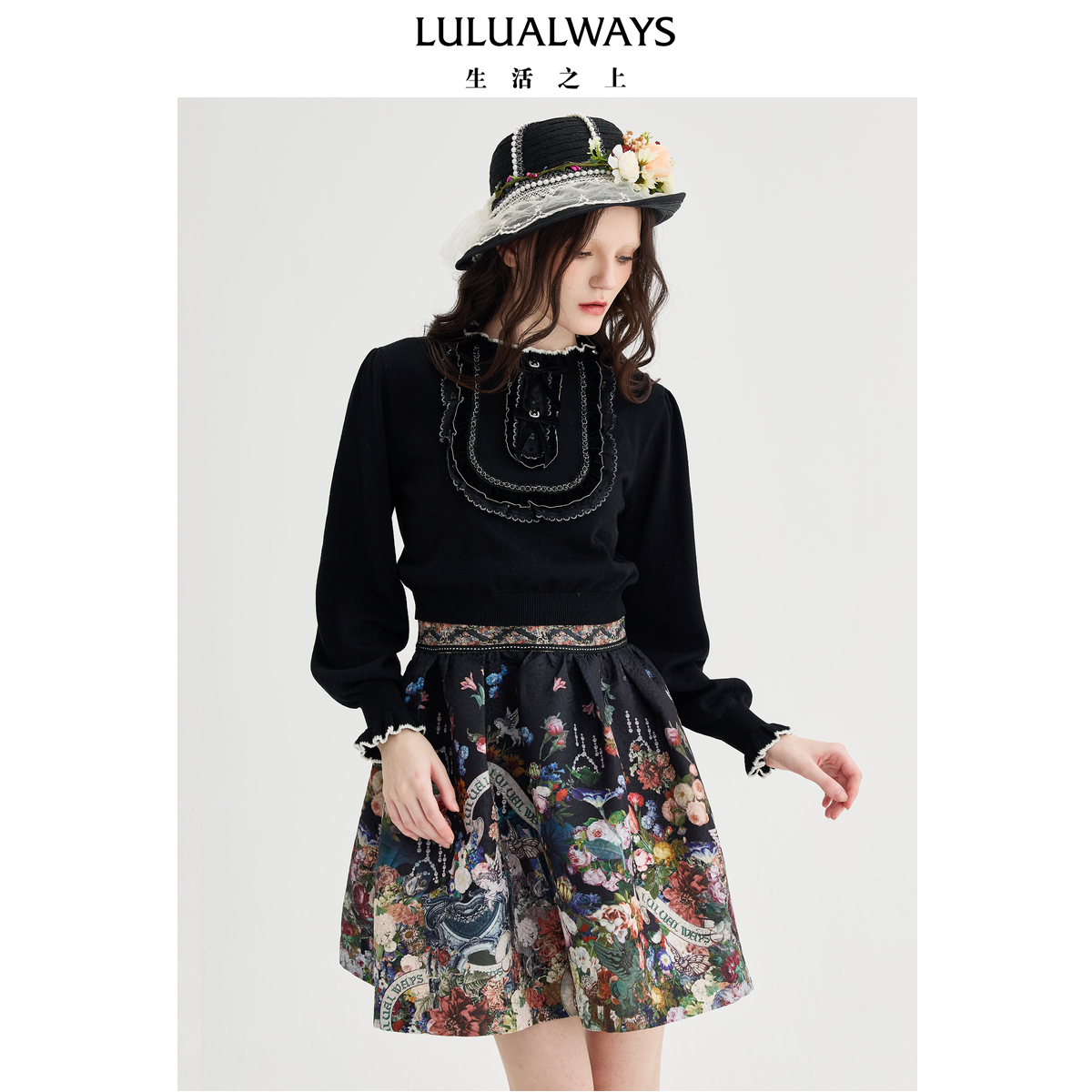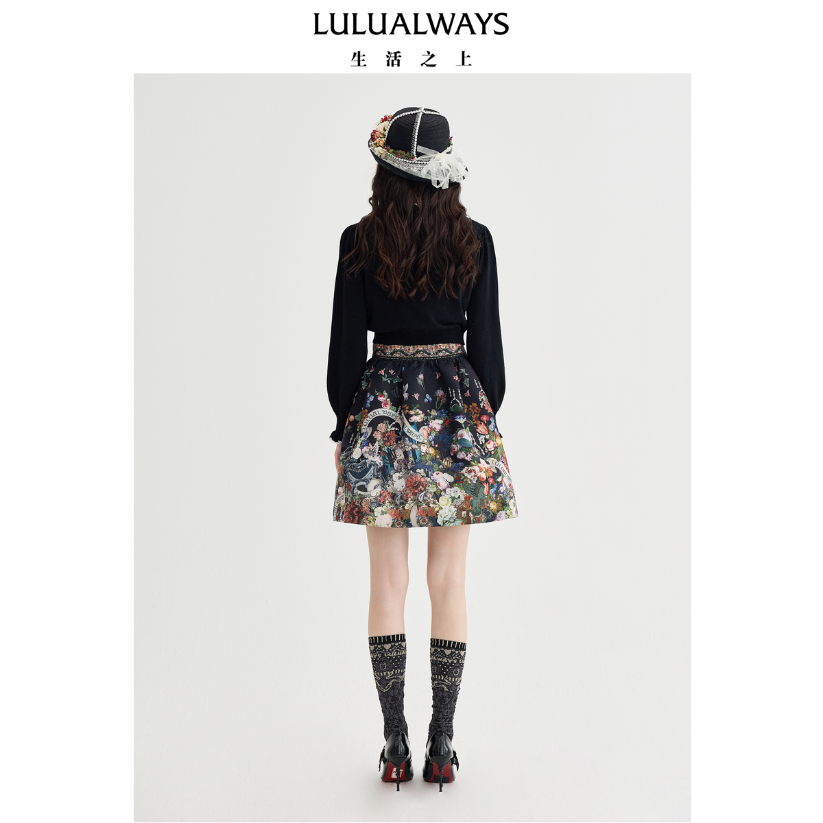 长袖 DPLAY2025年秋季 气质法式 黑色连衣裙女长款 雪纺印花裙子 新款
