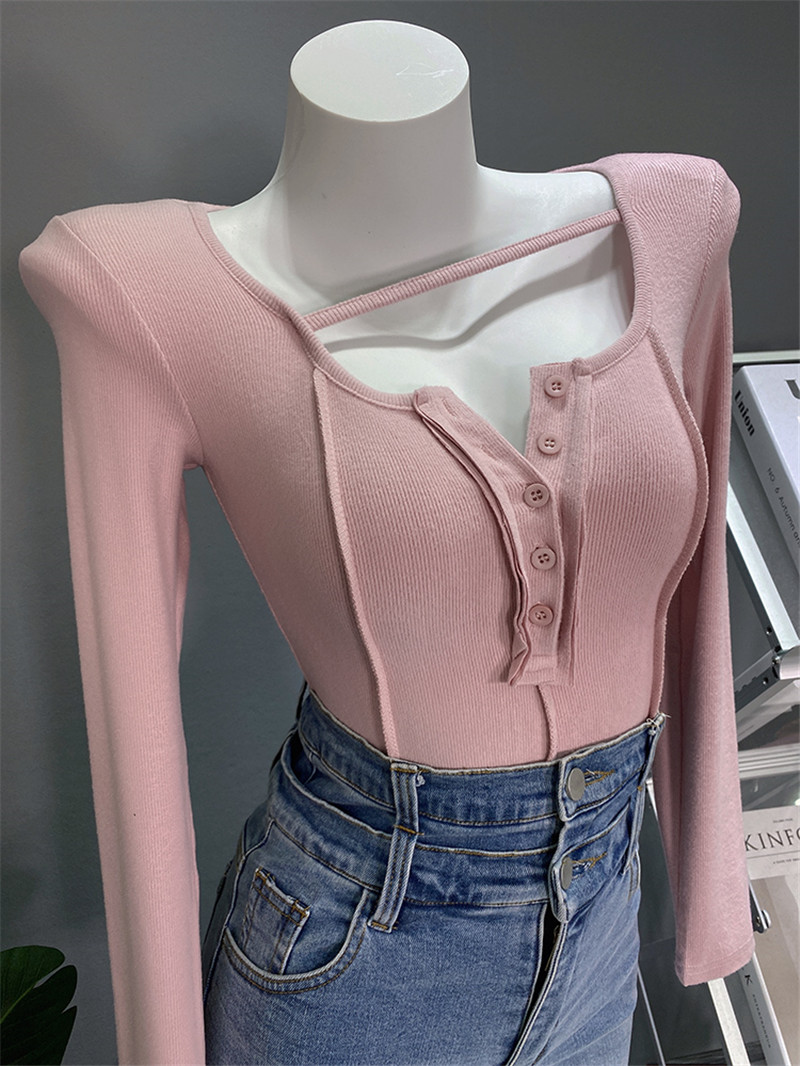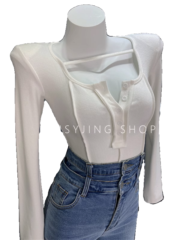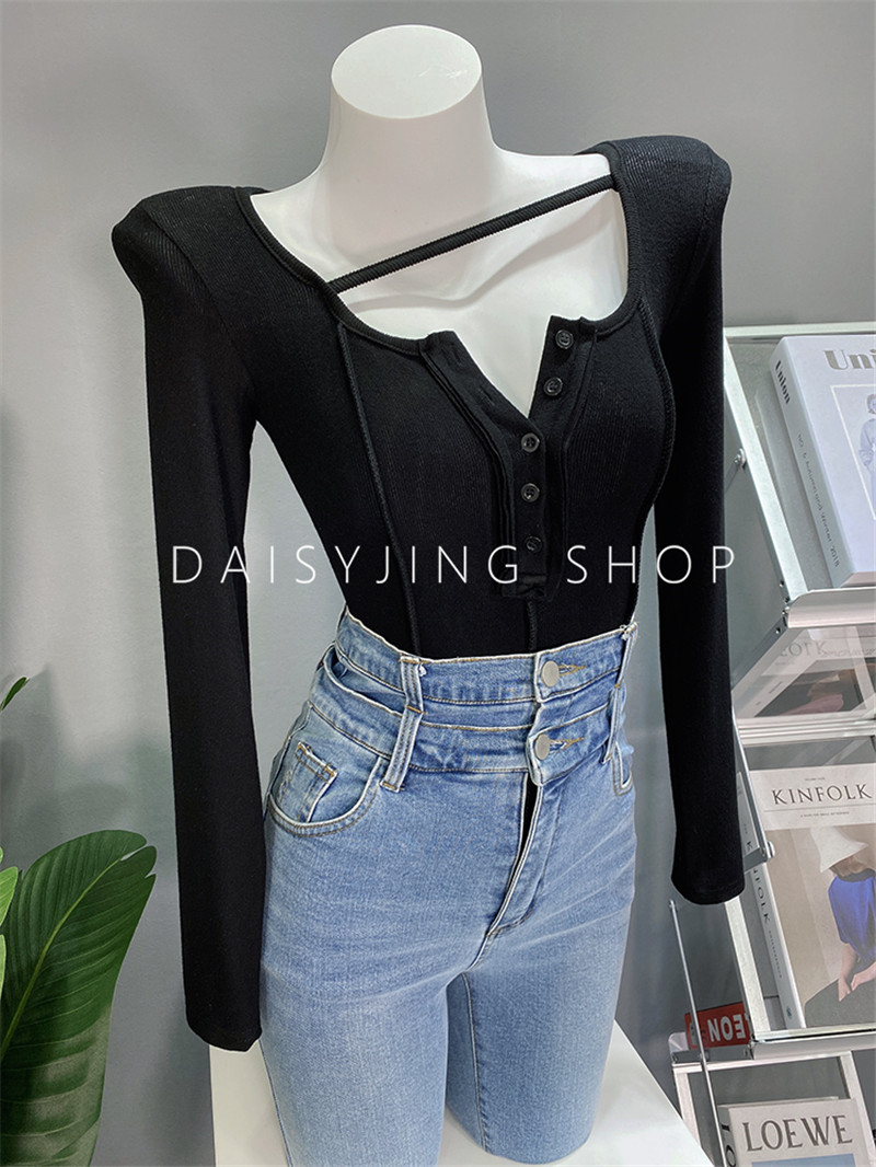 新款 t恤女上衣服打底衫 个性 长袖 U领纽扣垫肩紧身百搭短款 2024秋装