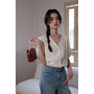 女装 胖MM显瘦时尚 高级感蕾丝V领衬衫 新品 气质衬衣 夏季 蓝若水大码