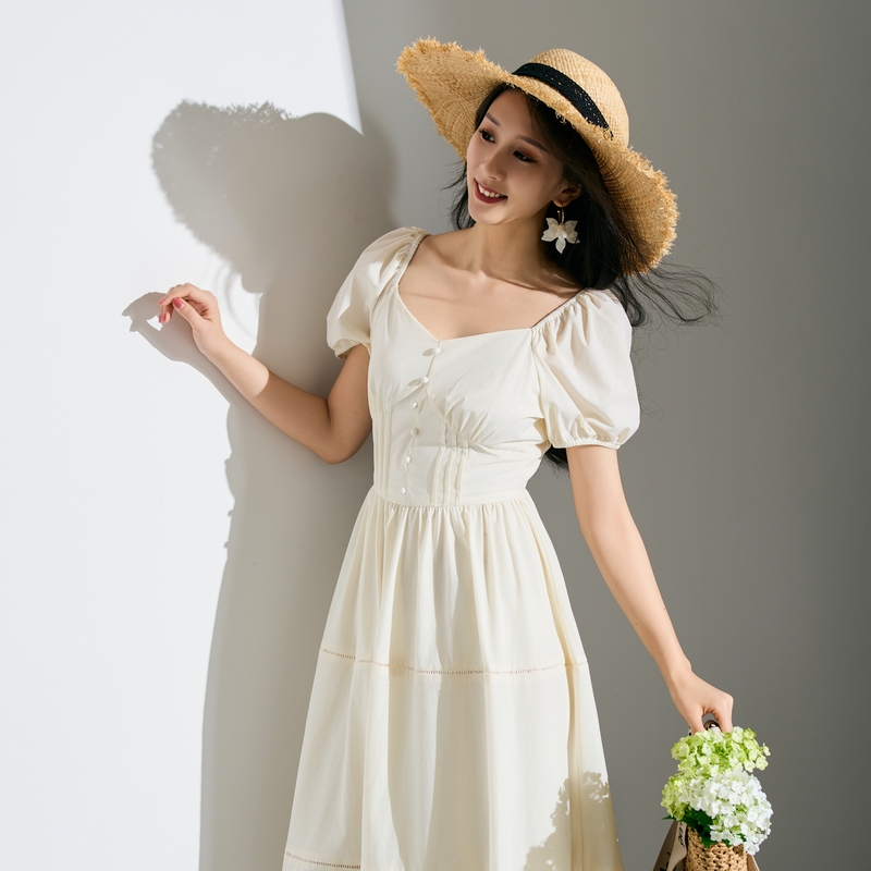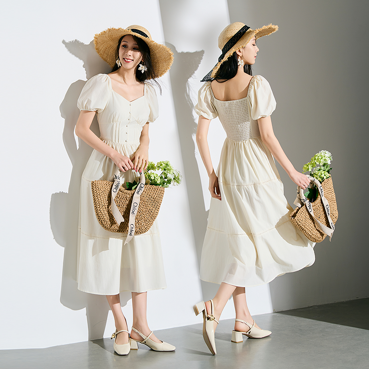 连衣裙a字收腰长裙 曼诺比菲夏优雅气质方领泡泡袖 优雅气质