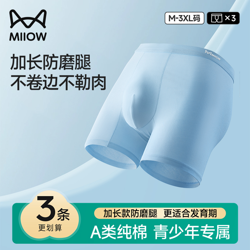猫人青少年内裤 男加长防磨腿发育期初高中生男孩纯棉100%全棉抑菌