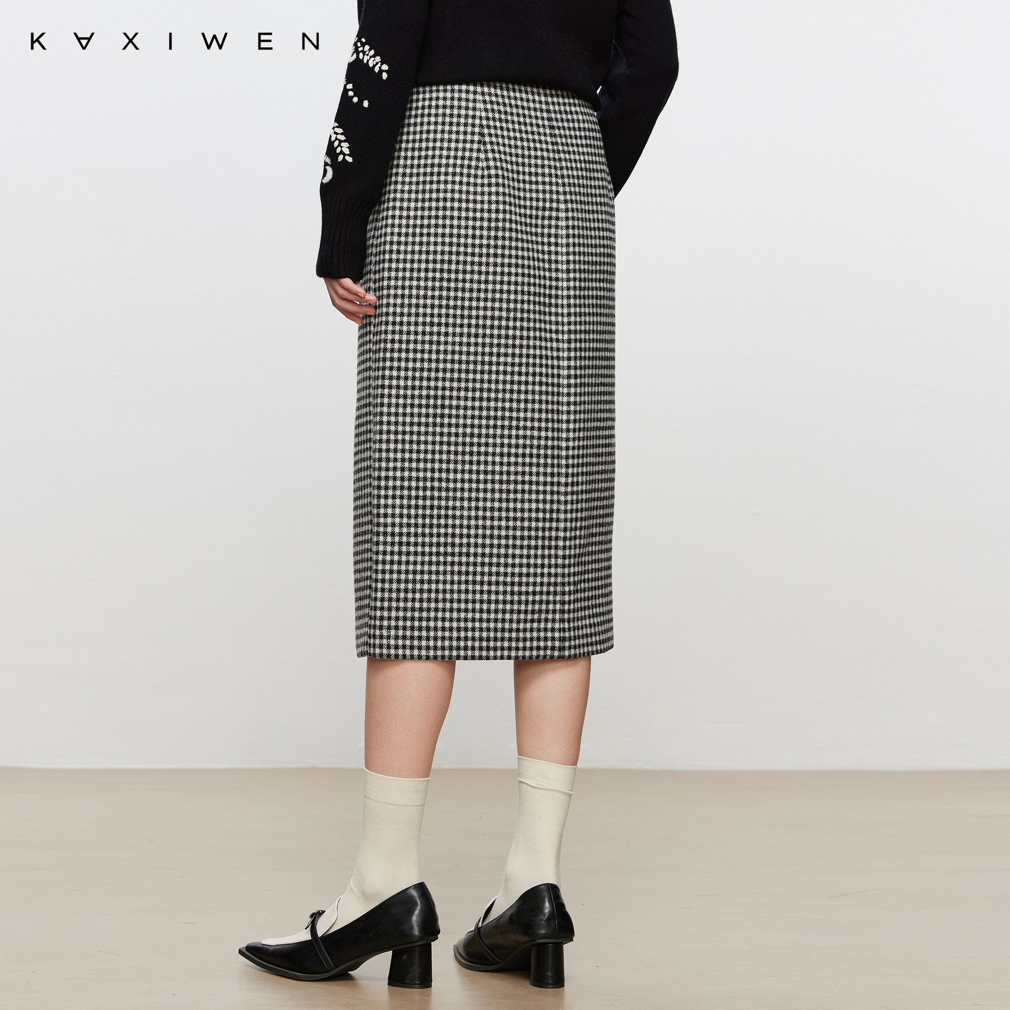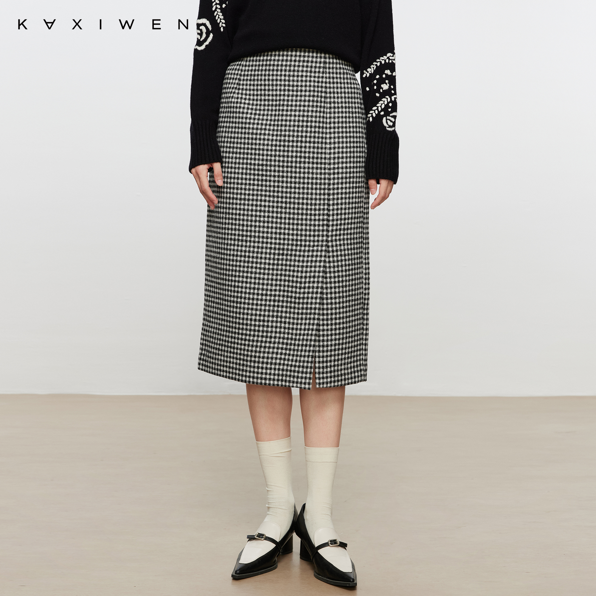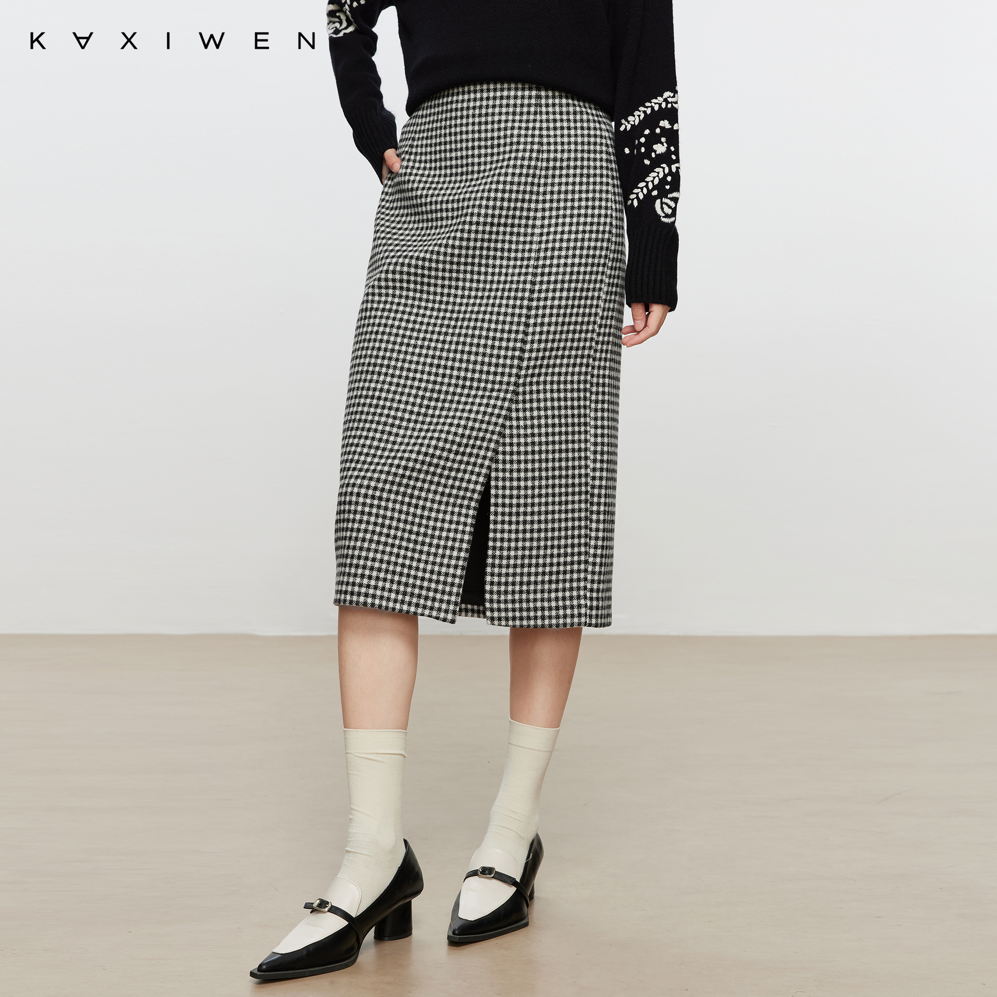 佧茜文羊毛复古开叉半身裙潮流冬季 亮丝撞色格纹直筒裙 新款