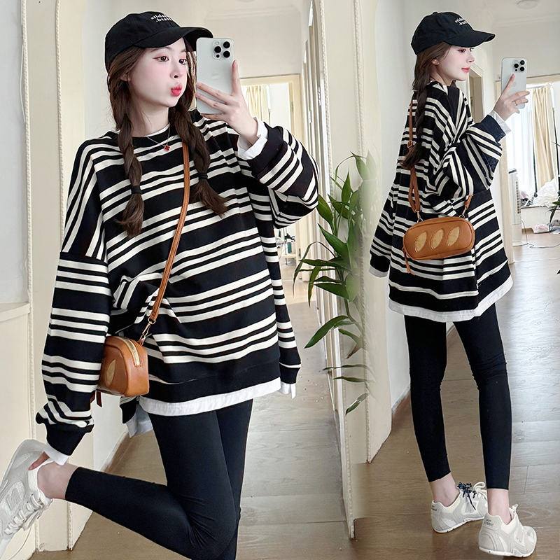 中长款 秋冬装 条纹T恤上衣拼接假两件显瘦200斤 孕妇卫衣套装 大码