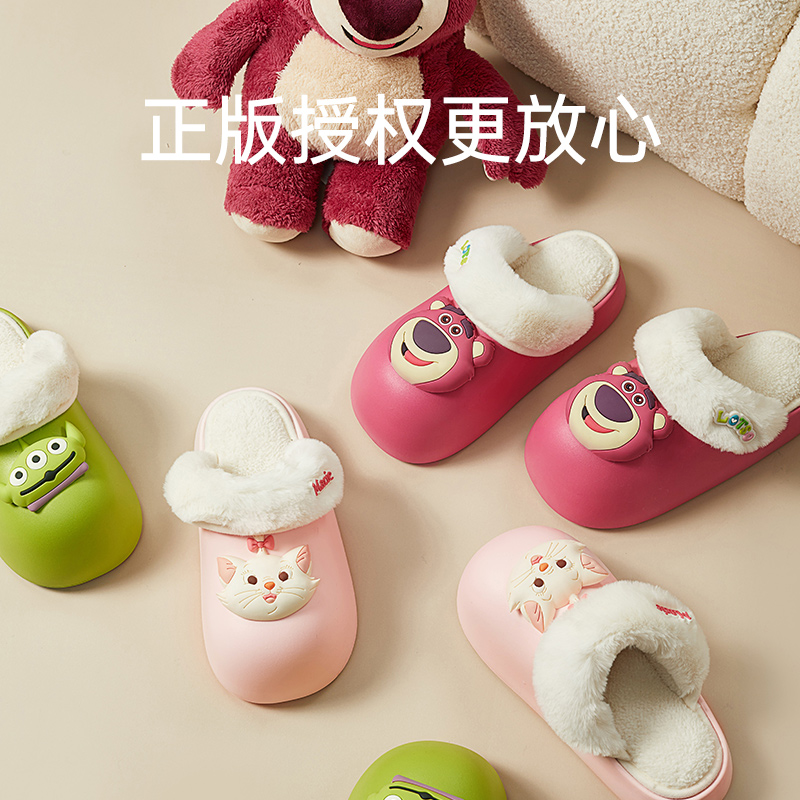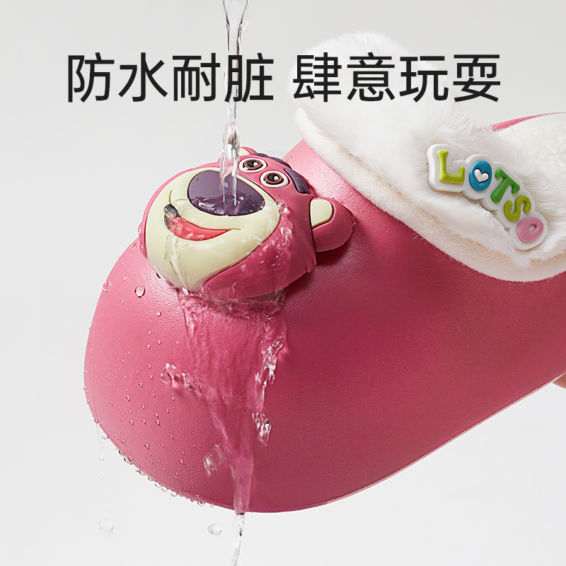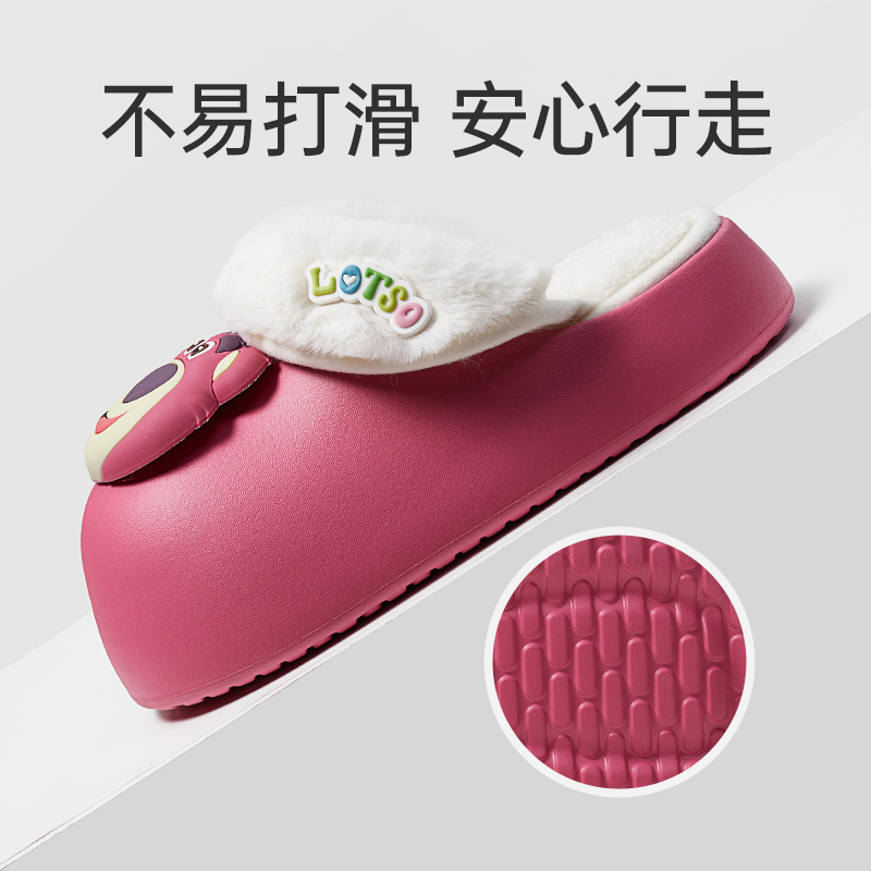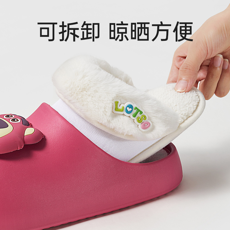 优调草莓熊防水棉拖鞋 女冬厚底可拆卸儿童居家保暖毛毛外穿迪士尼