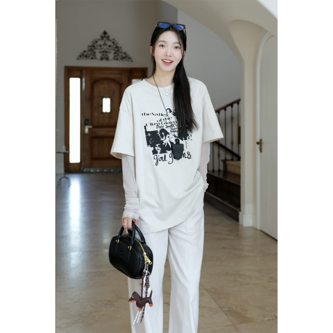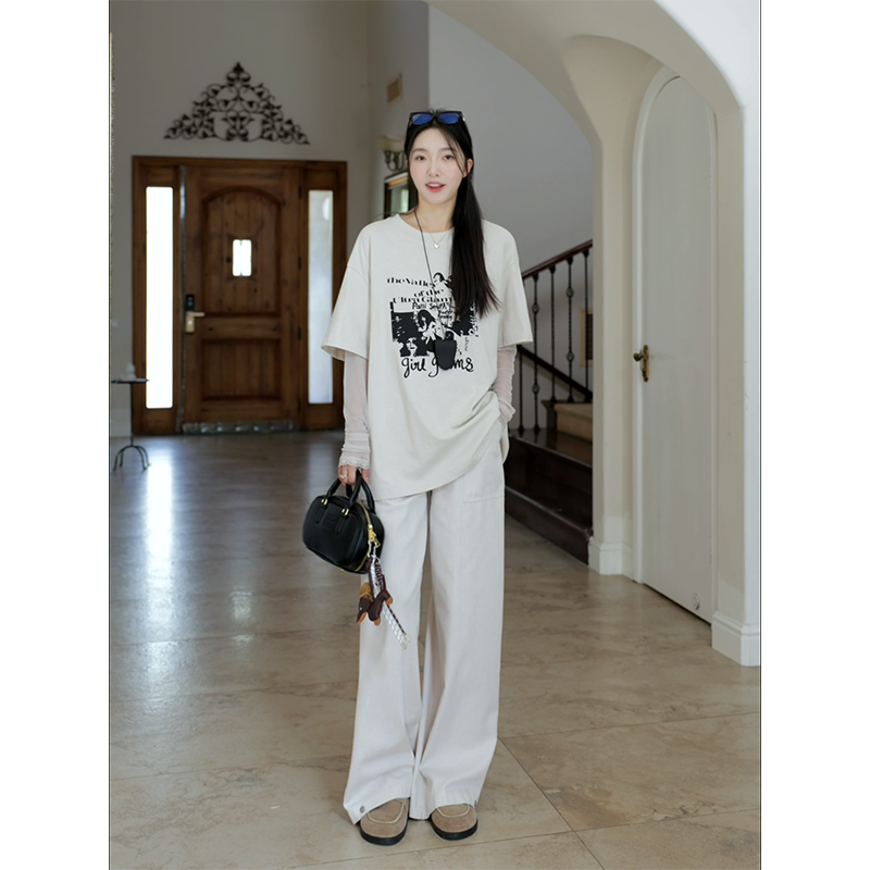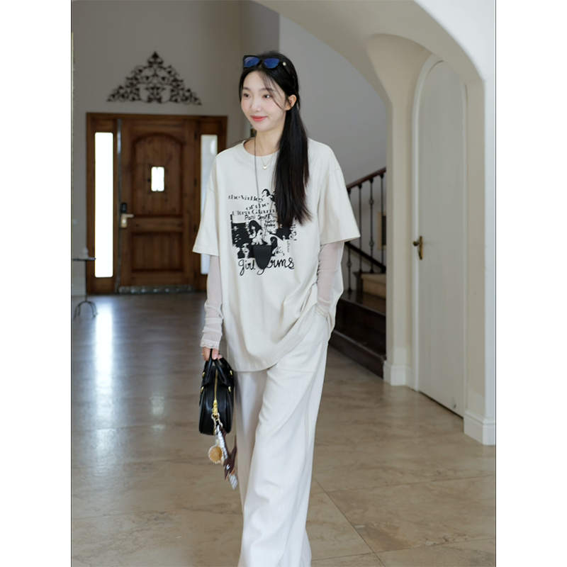 郭九九呢纯棉复古胶片感印花假两件拼接t恤简约上衣百搭阔腿长裤