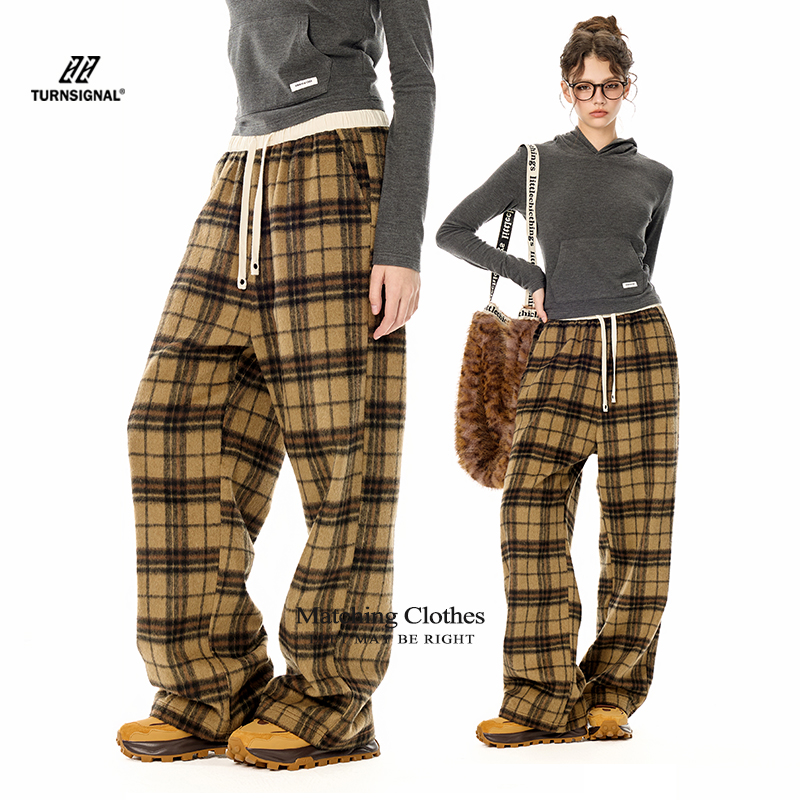 TurnSignal潮牌格子羊毛阔腿休闲裤 子 女春秋复古宽松直筒呢子长裤