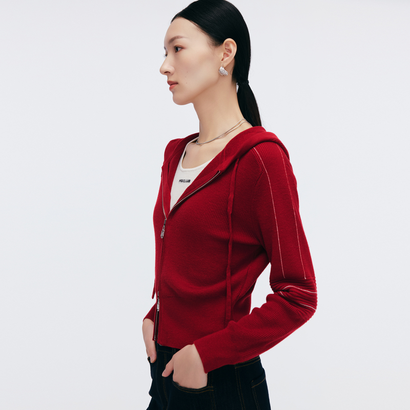 羊毛针织开衫 百家好2025秋新款 女连帽假两件毛衣外套 House Basic