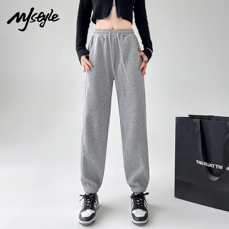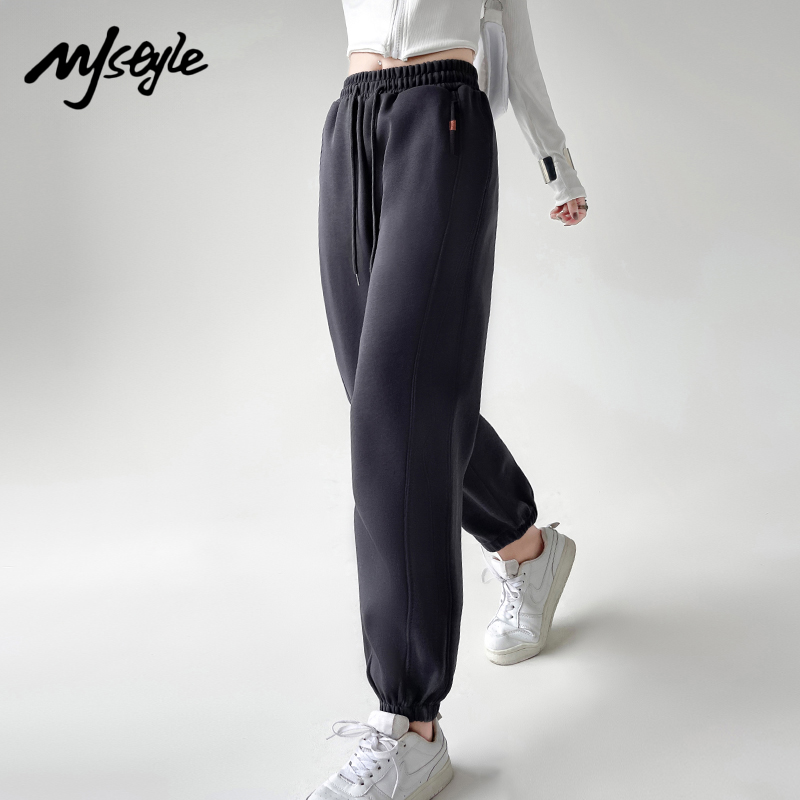 加绒街舞穿搭褶皱宽松休闲长裤 女秋冬季 子 灰色运动卫裤 自然涩美式