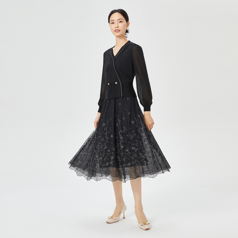 娜尔思气质V领黑色连衣裙女25早秋A字裙 NAERSI 纤腰连衣裙