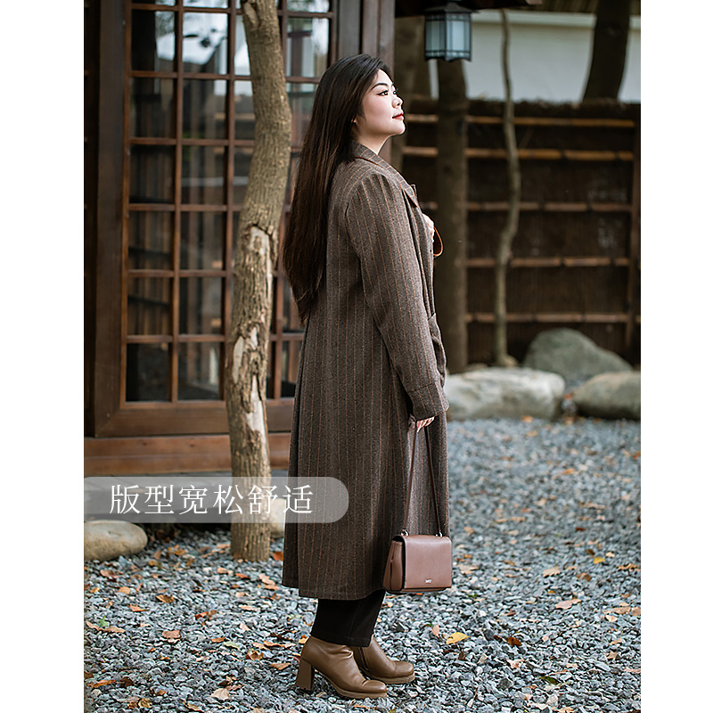 美丽客栈八零九零大衣女秋冬高级感大码 外套 胖MM条纹复古风中长款