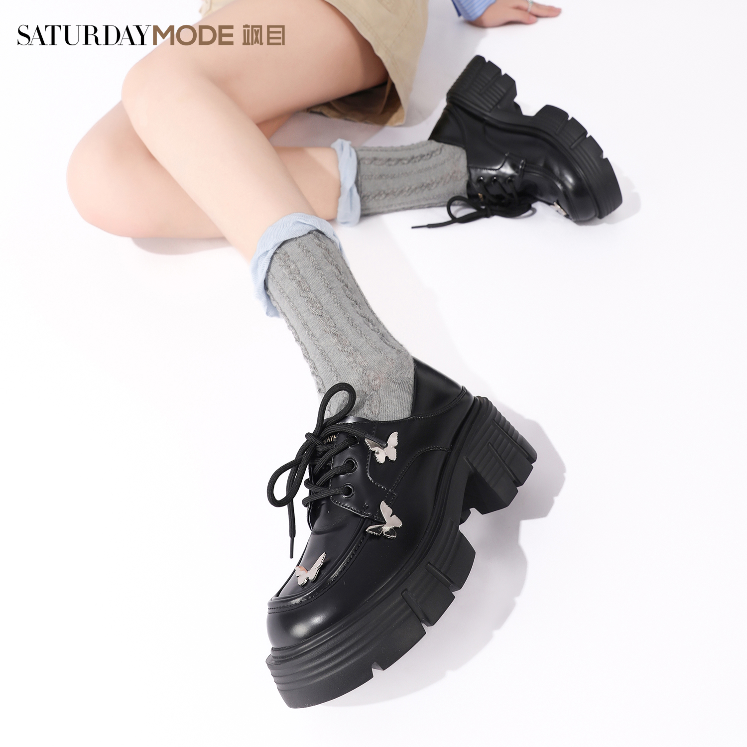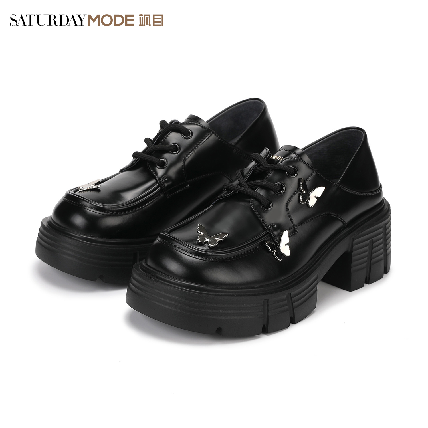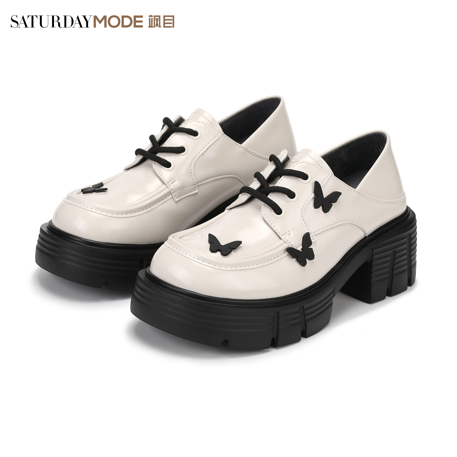 英伦金属蝴蝶黑白色深口高跟女鞋 星期六甜美厚底乐福秋季 新款