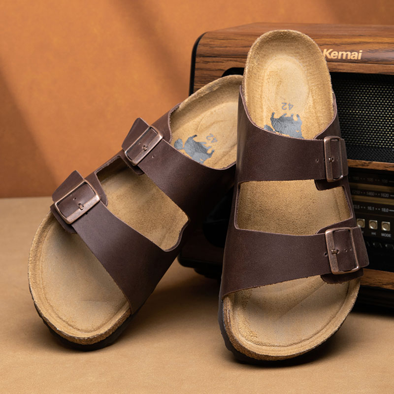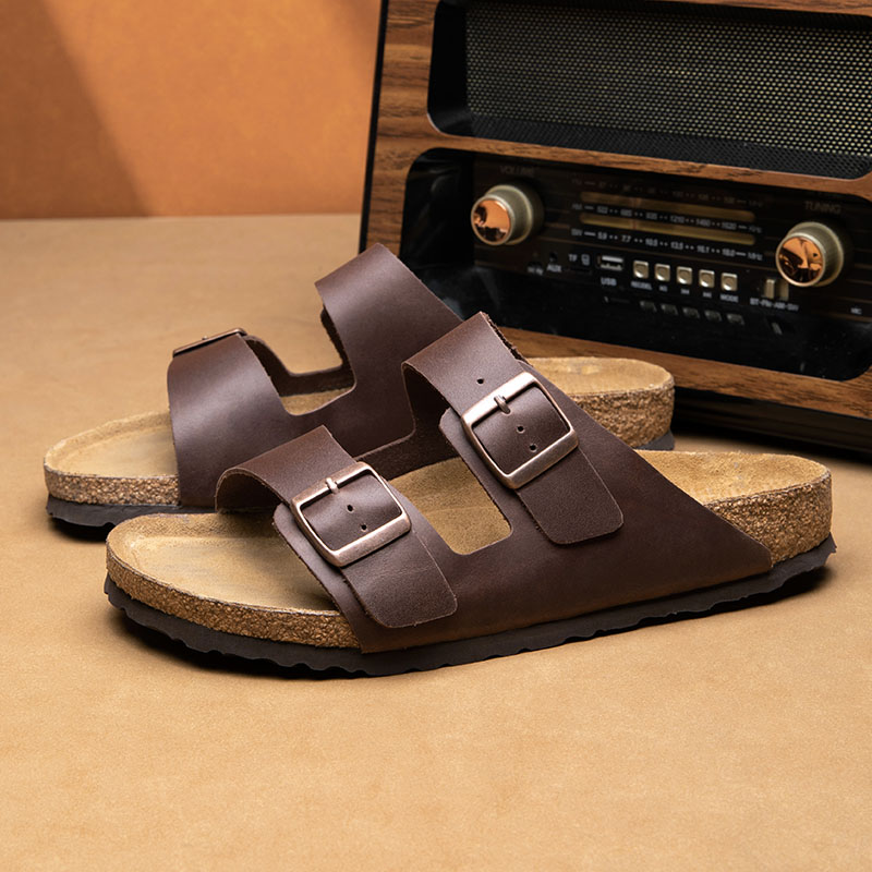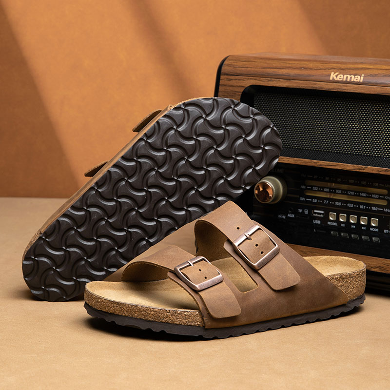 潮百搭复古真皮休闲一字拖鞋 沙滩鞋 男外穿开车 男士 牛皮软底勃肯鞋