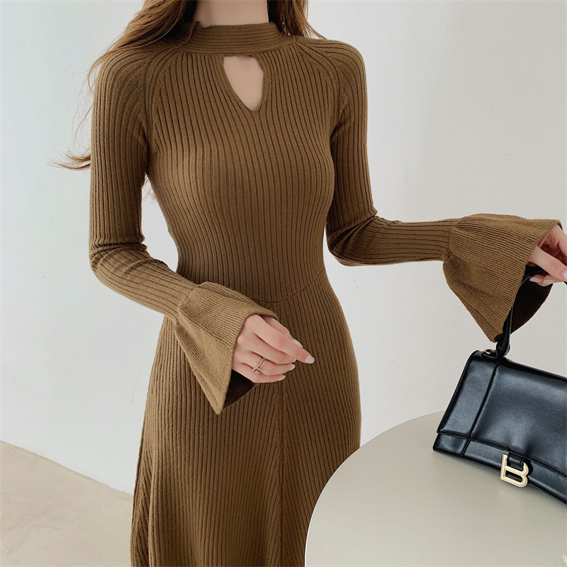 鱼尾毛衣打底裙 过膝收腰喇叭袖 镂空半高领针织连衣裙女秋冬季 长款