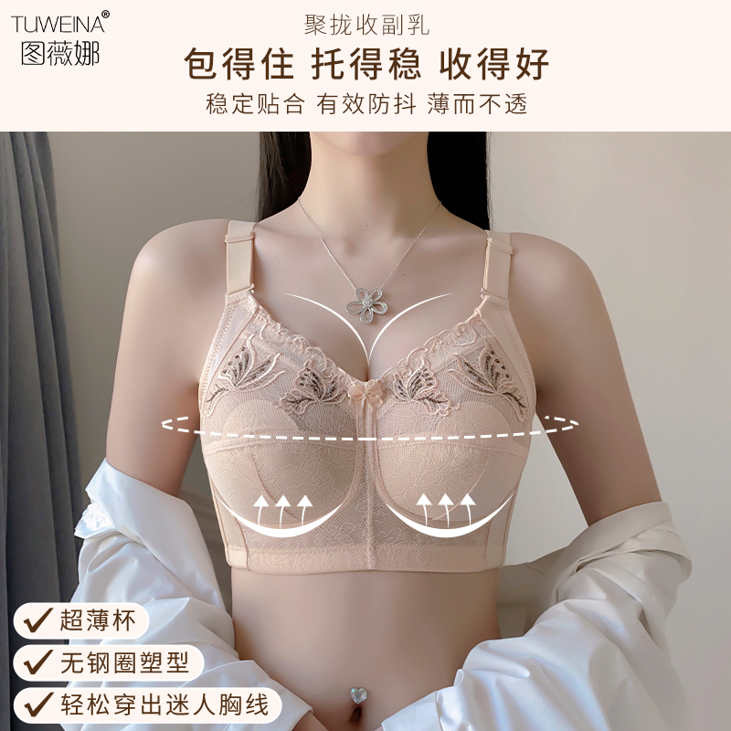 润微茶肌内衣女士大胸显小薄款 上托防下垂蕾丝文胸 收副乳聚拢大码