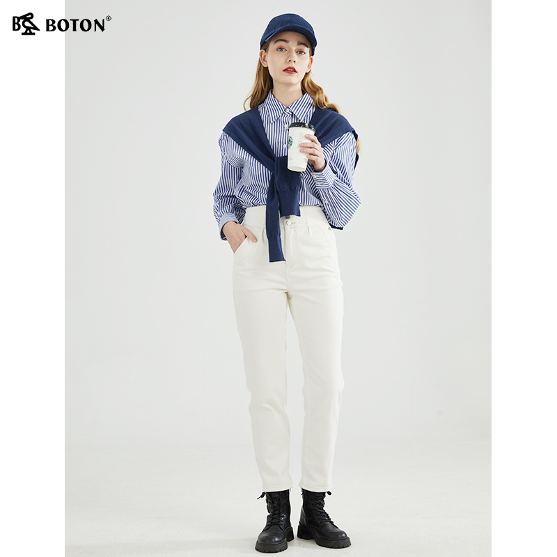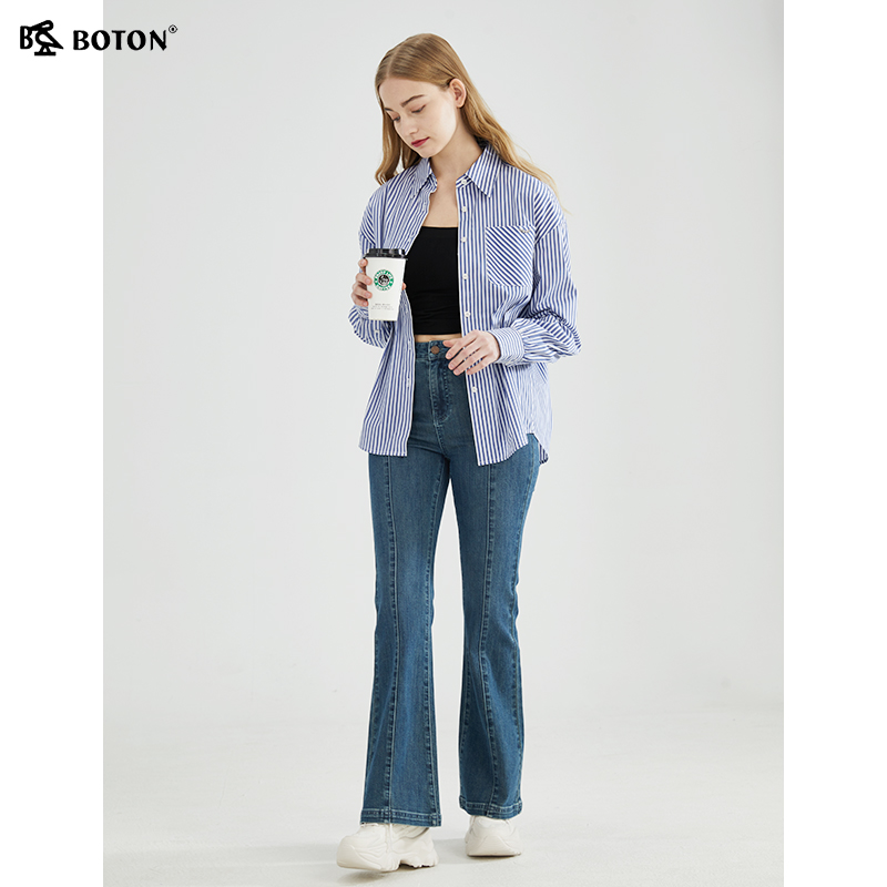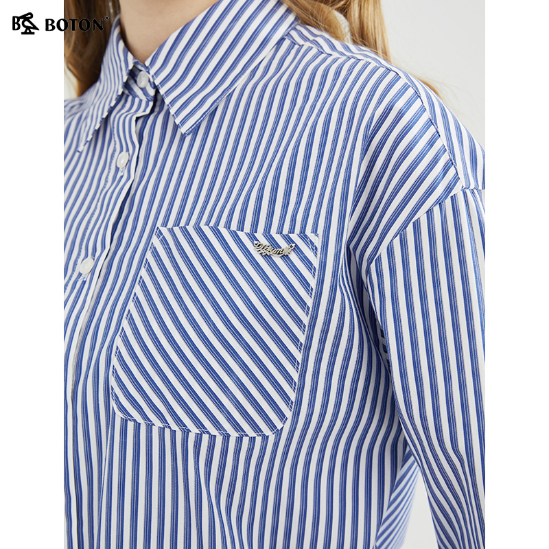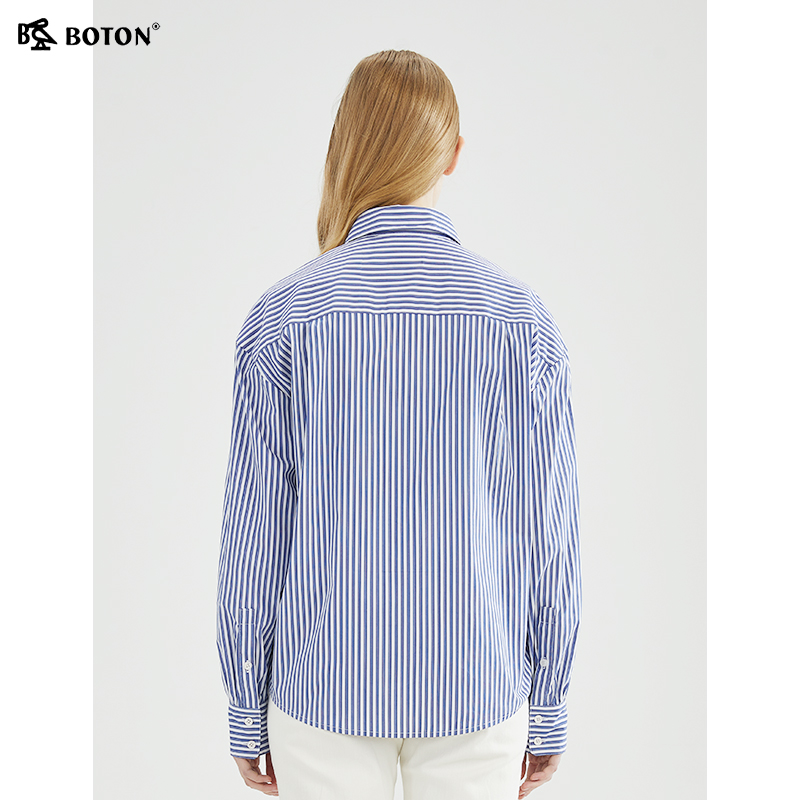 蓝白竖条纹衬衫 波顿2025春秋女高端宽松长袖 柔软亲肤 高支长绒棉
