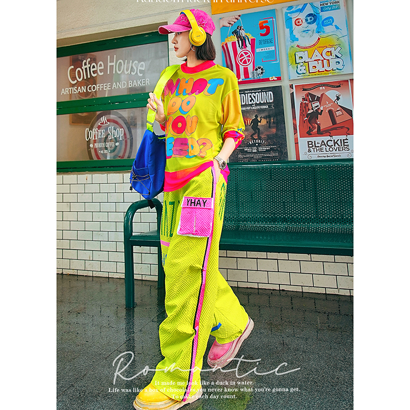 YHAY荧光黄彩色字母休闲T恤春夏新款 撞色图案潮牌宽松网纱打底衫