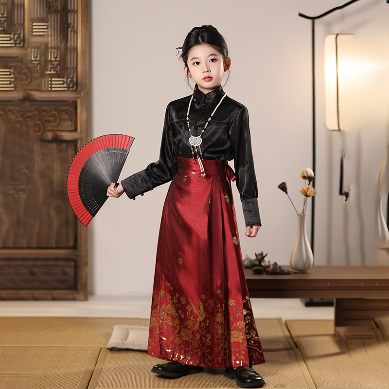 演出服装 儿童国风汉服黑上衣长袖 秋季 中秋红色织金女童马面裙套装