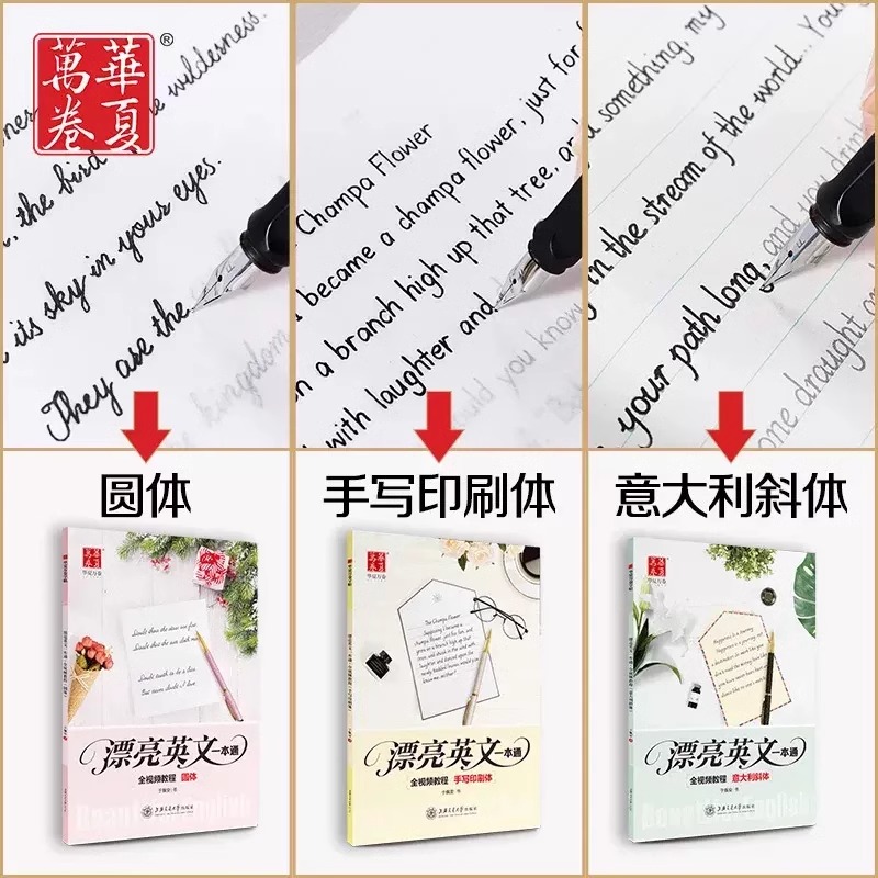 华夏万卷漂亮英文一本通圆体手写印刷体意大利斜体英语字帖成人高中初中大学生书法钢笔硬笔描红速成字帖男生女生漂亮字体临摹本