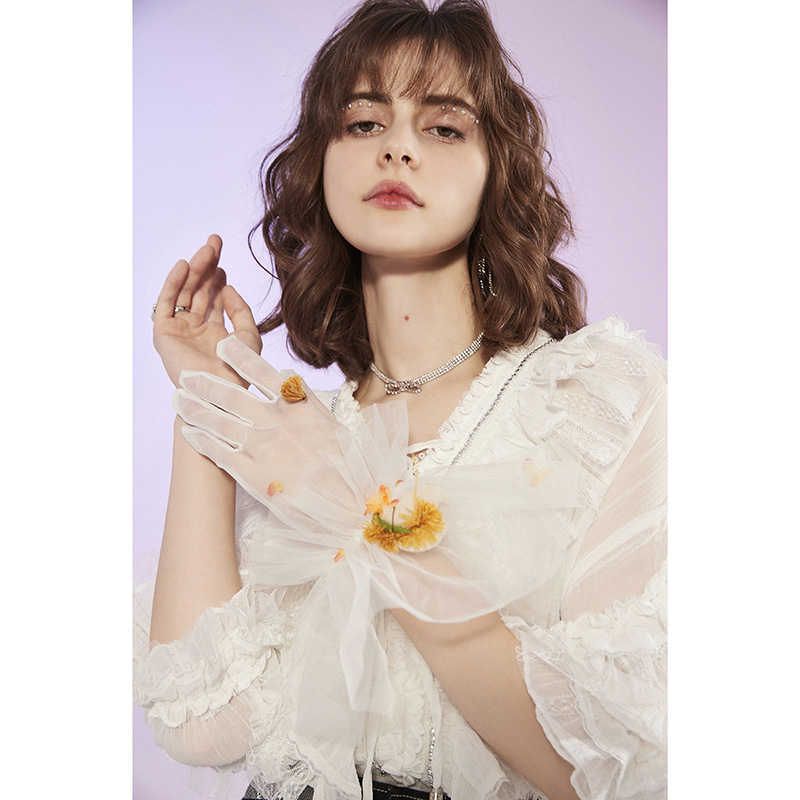衫 直播年新国潮甜酷花边V领系带雪纺蕾丝中袖 71AW319001 莲灿