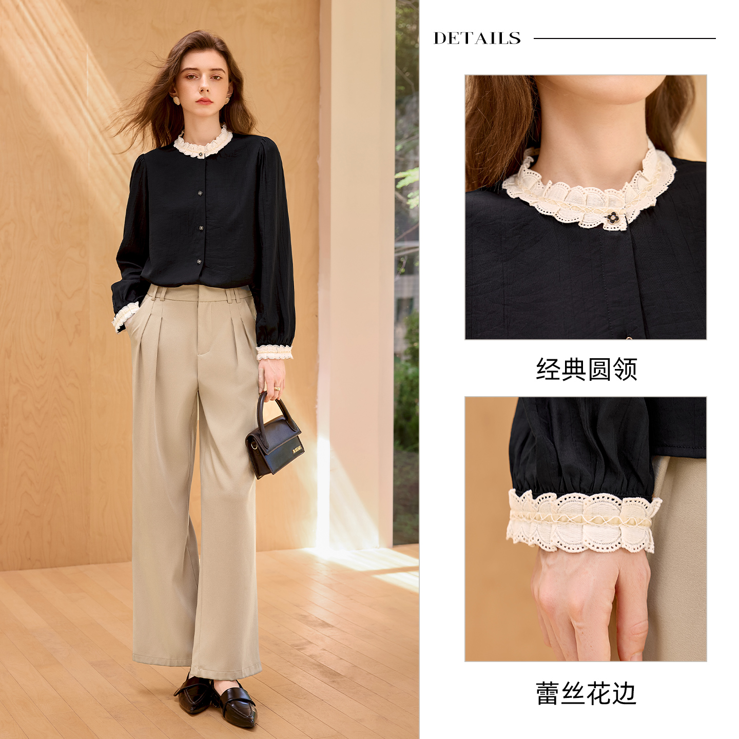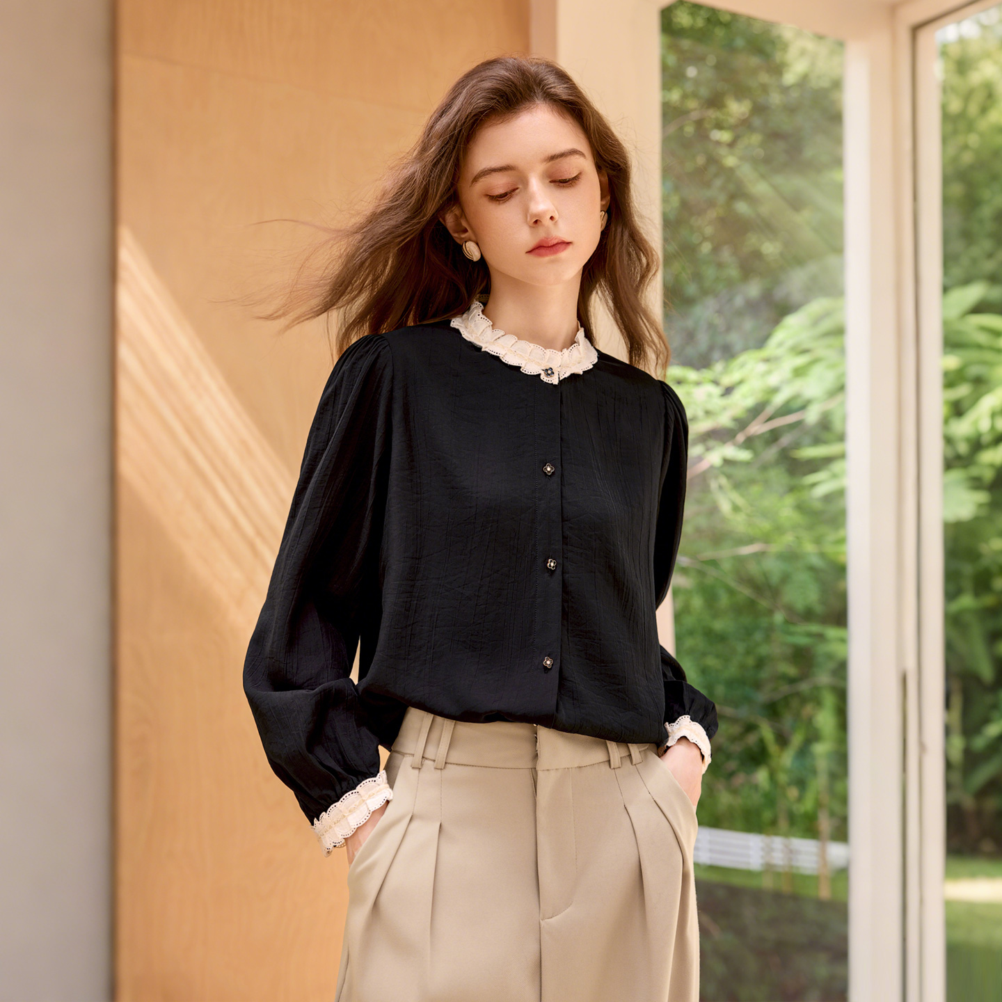 黑色翻领衬衫 男士 商务休闲衬衣男羊绒混纺纯色衬衫 太平鸟男装