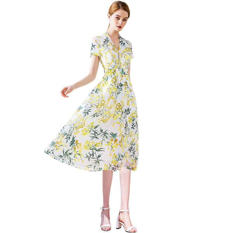 气质收腰A裙黄 法式 黛薇璐媤V领碎花雪纺公主连衣裙女2025夏季 新款