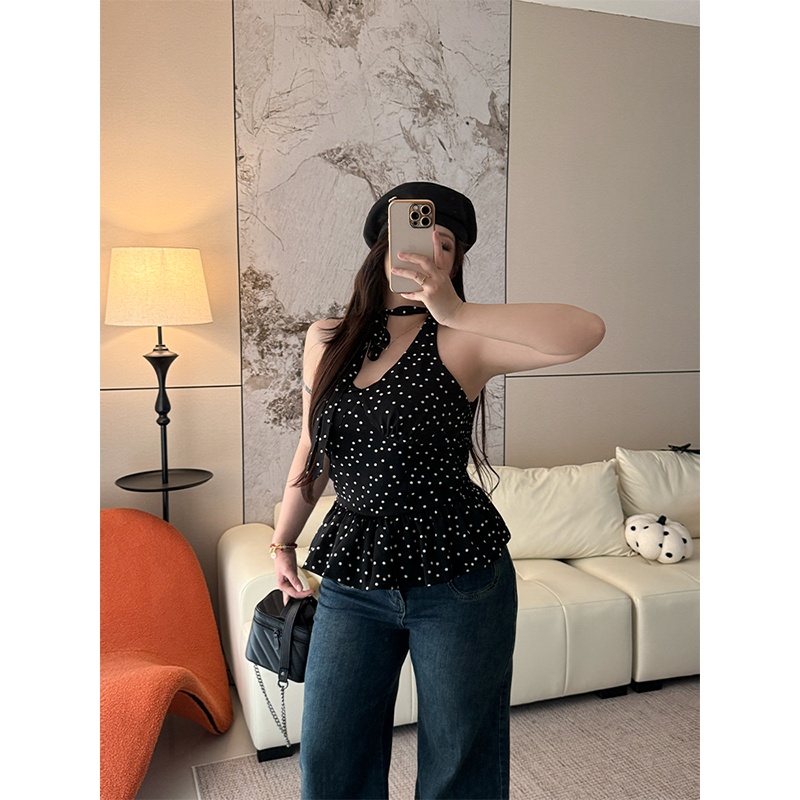 波点挂脖吊带背心微胖显瘦辣妹露背短款 初夏海风 上衣 babes