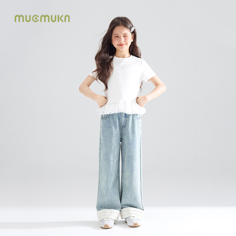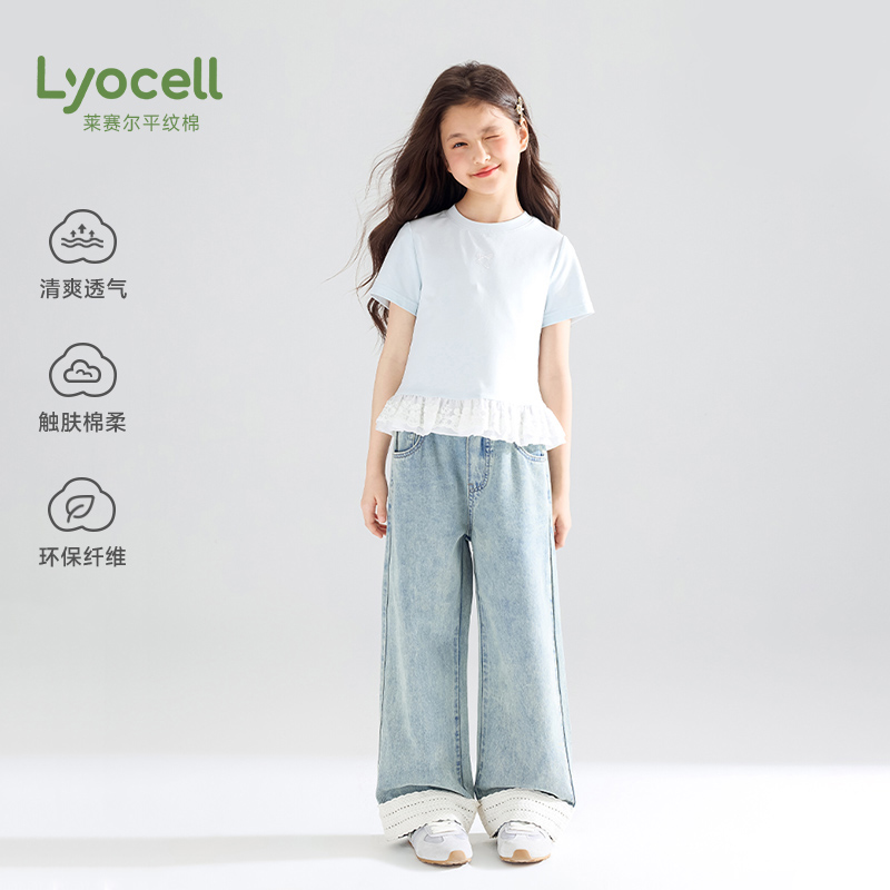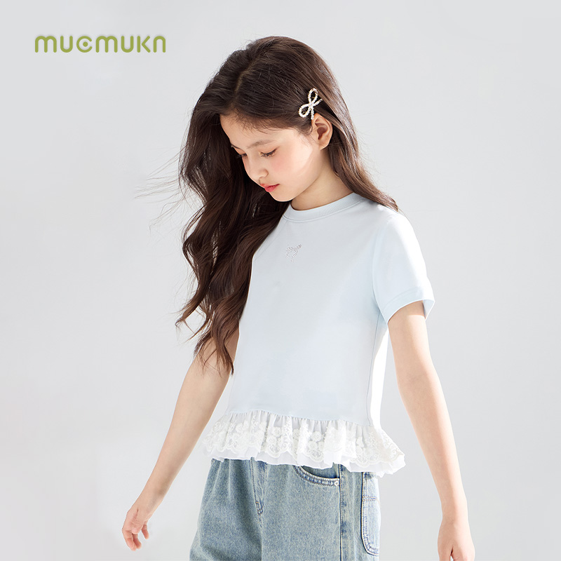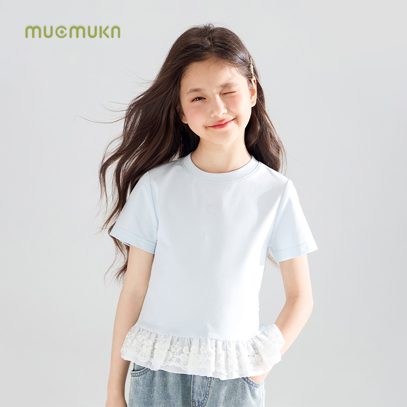 蝴蝶结烫钻印花短袖 20莱赛尔70棉 蕾丝花边T恤女童 云顶奶茉