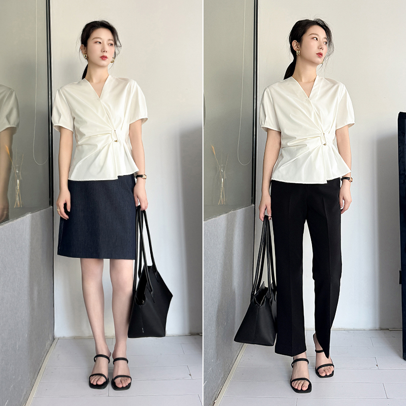 收腰衬衫 短款 女上衣设计感修身 v领短袖 气质通勤衬衣 显瘦法式 夏季