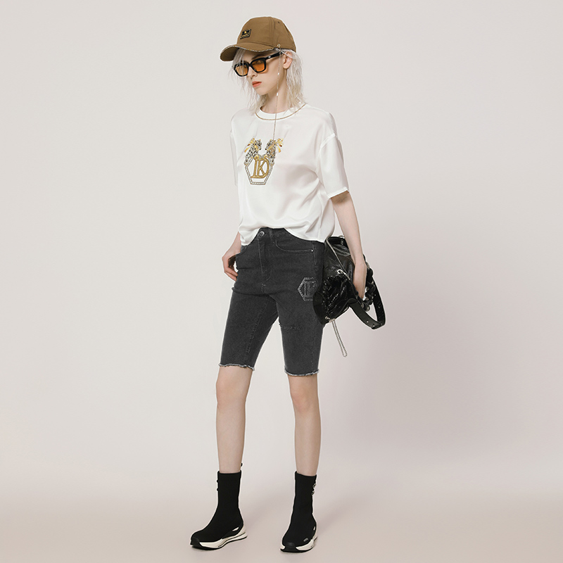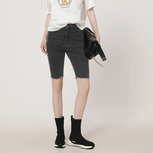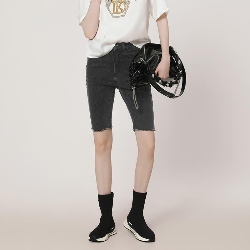 黑色棉质牛仔短裤 裤 修身 女装 烫钻破洞毛边四分裤 kodice春夏新款