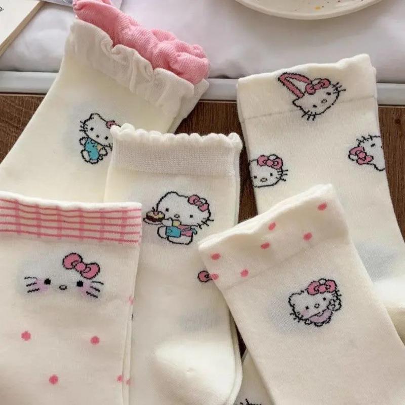 旅游百搭kt猫袜子女中筒袜春夏季 日系甜美卡通花边长袜白色长 薄款