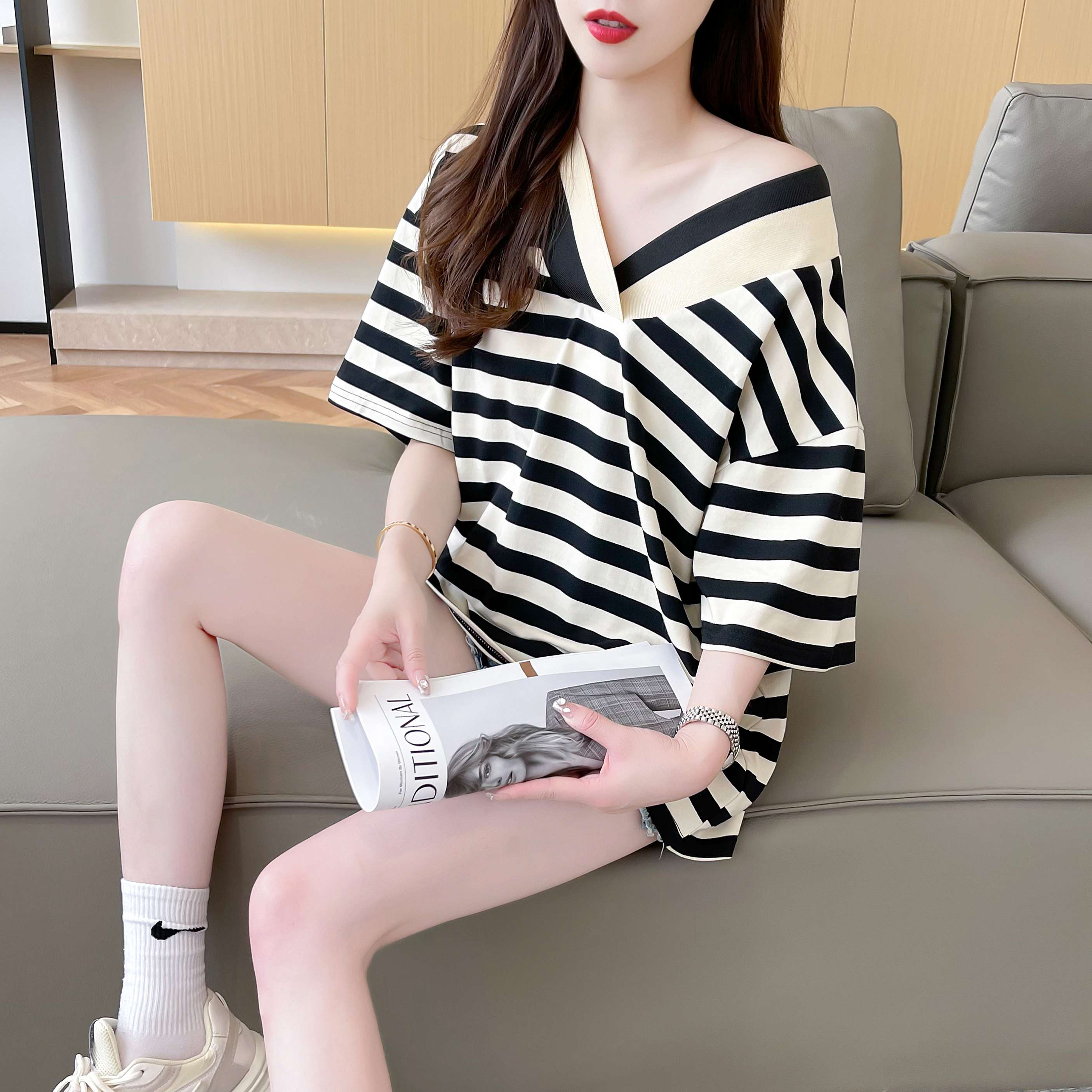 宽松百搭大码 条纹V领设计感短袖 韩版 新款 胖mm上衣潮 T恤女2023夏季