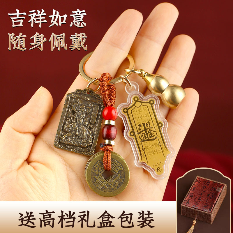 黄铜赵公明财神令牌五帝葫芦铜钱钥匙扣朱砂挂件五路武财神爷随身