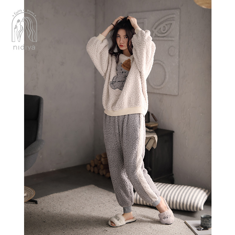 妮狄娅睡衣女冬季 珊瑚绒加厚羊羔绒套头可外穿休闲秋冬家居服套装