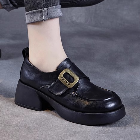 百搭英伦风头层牛皮女鞋 女士厚底粗跟冬季 子 真皮乐福鞋 欧易金新款
