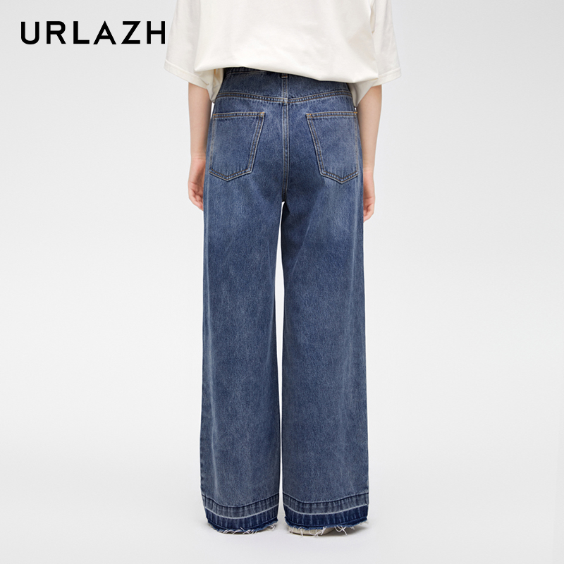 URLAZH有兰新款 复古水洗牛仔蓝纯棉休闲宽松直筒显瘦毛边牛仔裤